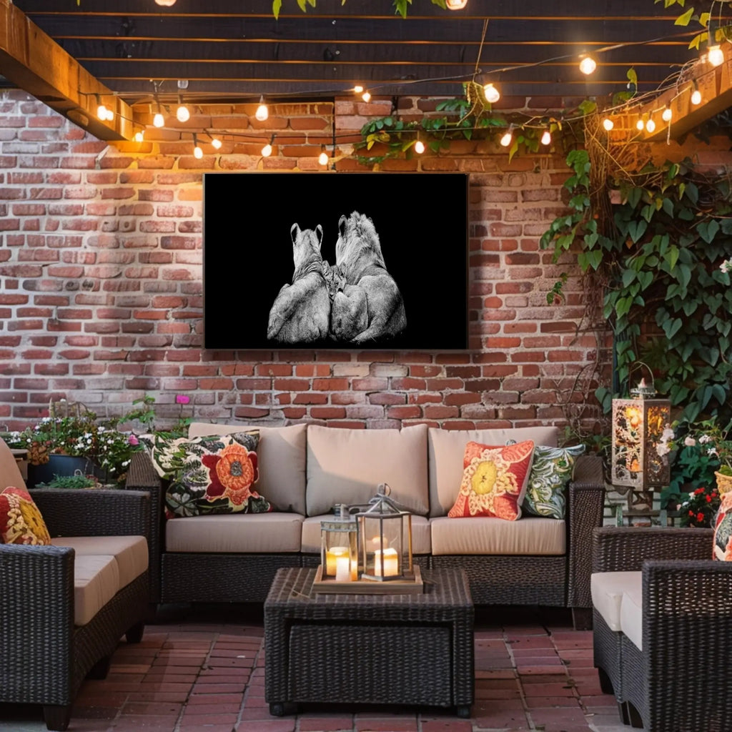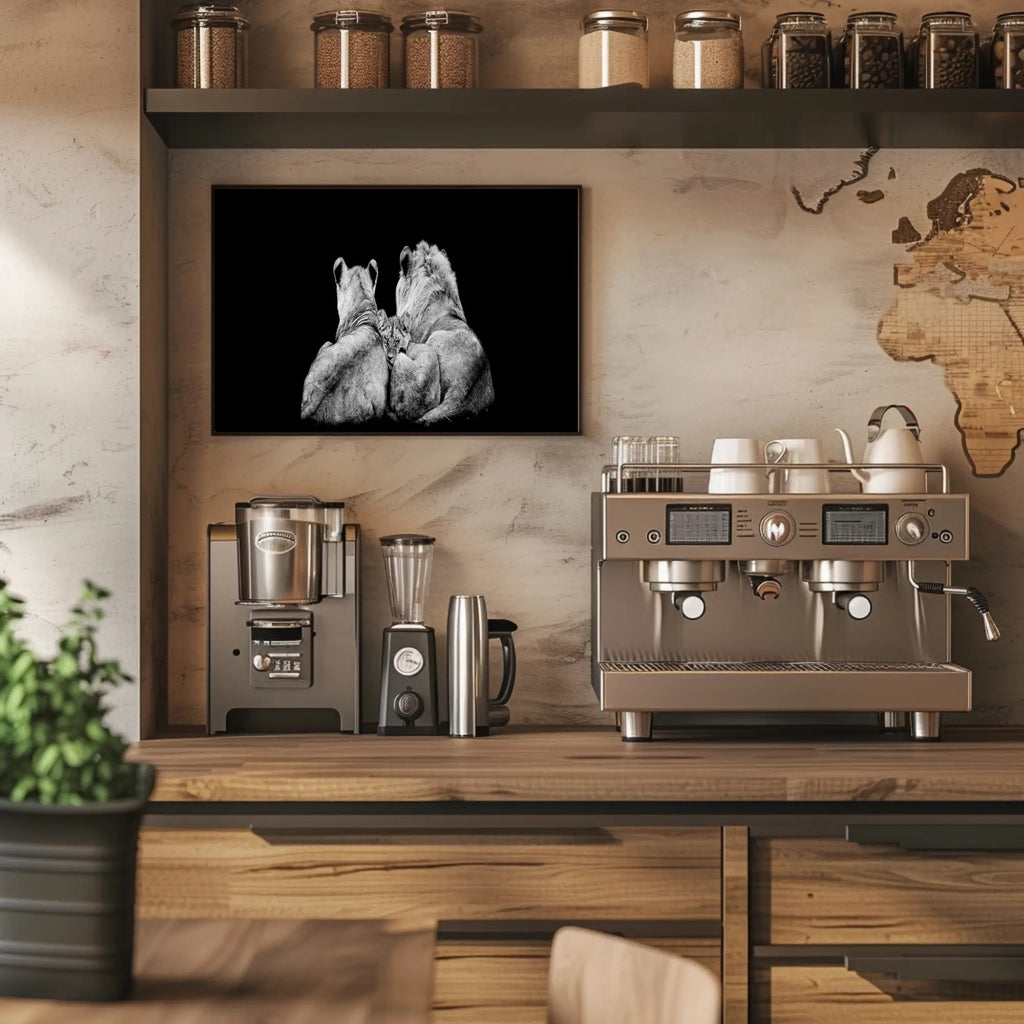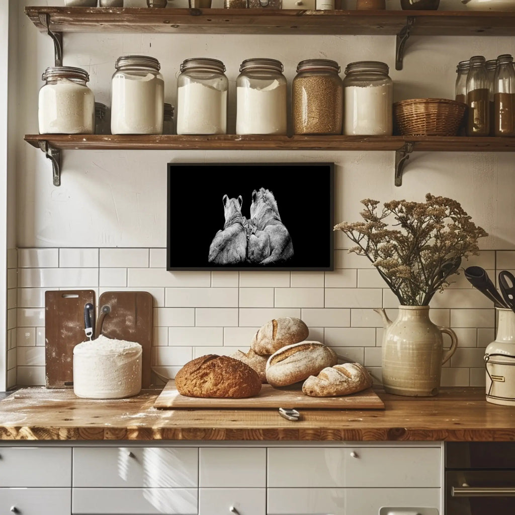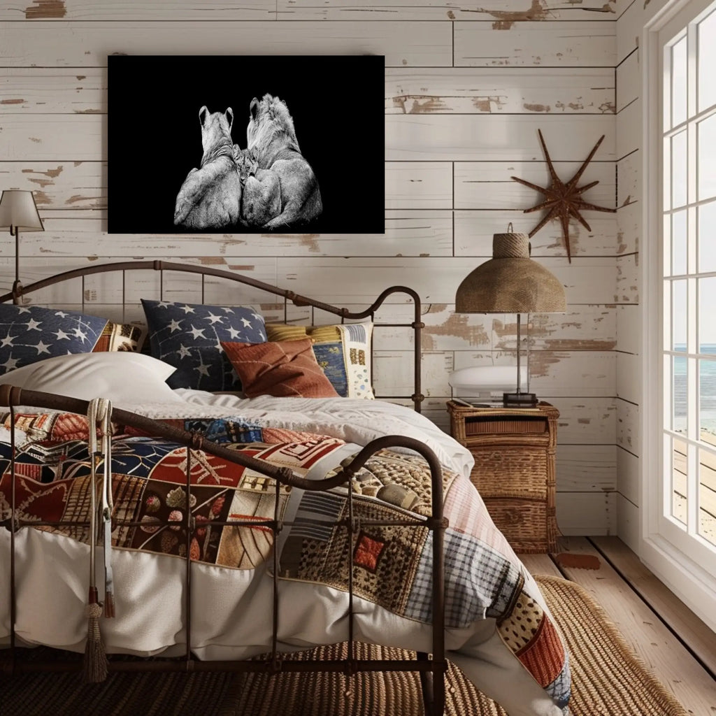 - Designer aesthetic: High-contrast monochrome print that emphasizes fur detail, silhouette and emotion — perfect for modern, industrial or minimalist interiors.