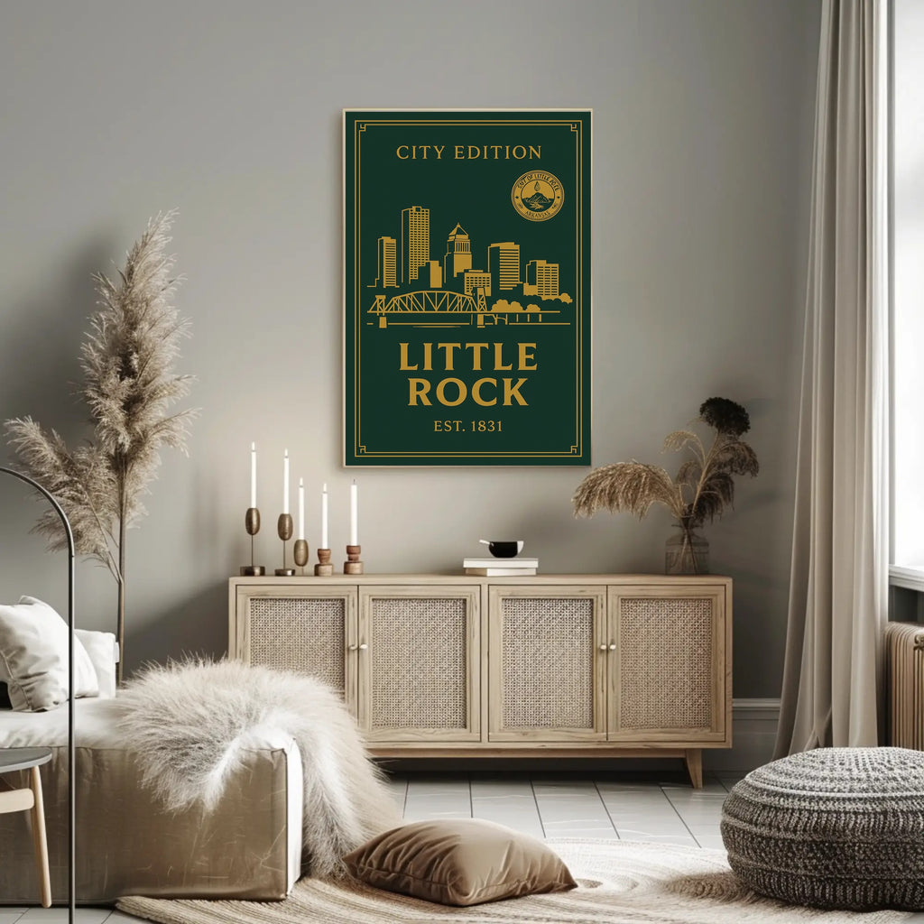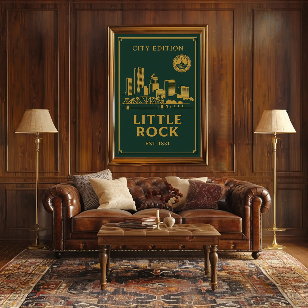 Little Rock City Edition Poster from PosterGoat brings a refined, travel-inspired focal point to any room. Printed with a minimalist aesthetic, this 18x24 poster pairs a deep green background with gold-foil style skyline artwork—featuring the river bridge, downtown silhouette and a classic city seal—evoking Little Rock’s historic charm and urban energy.