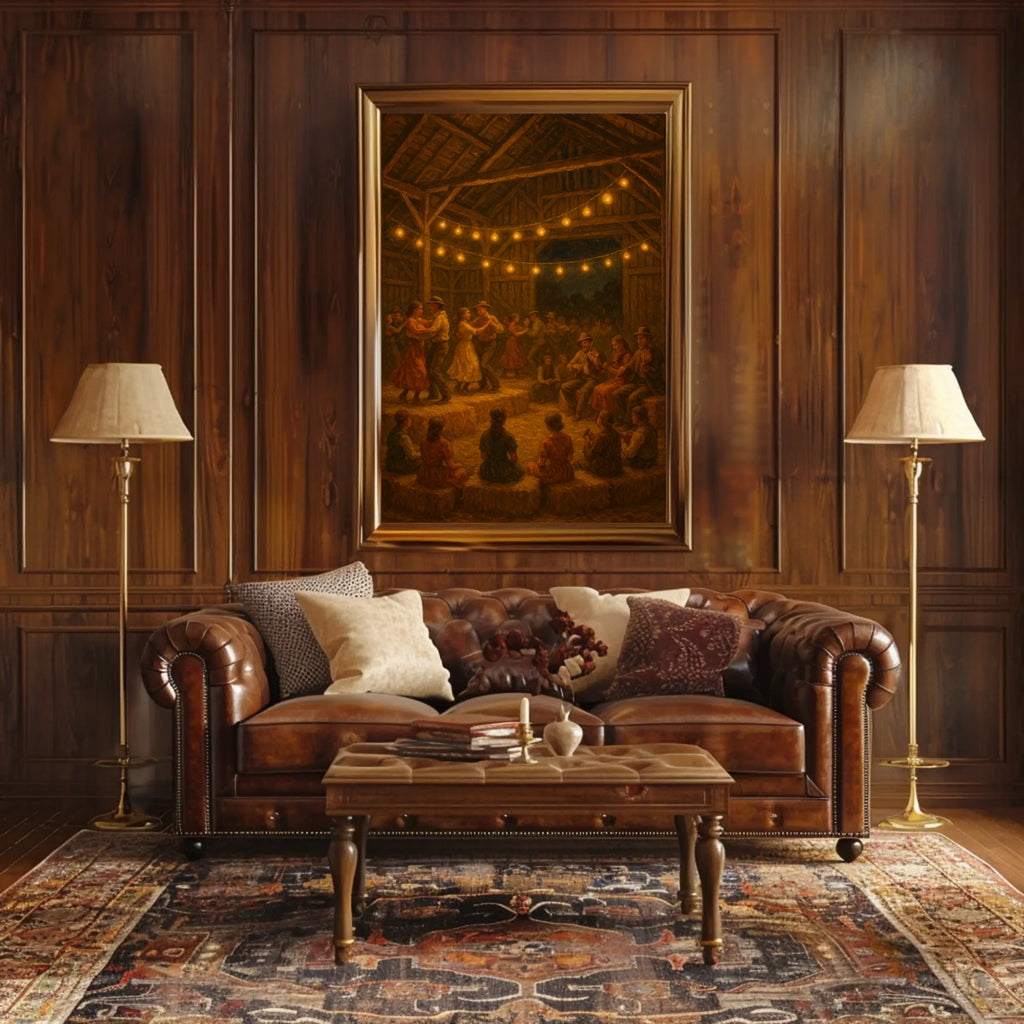 Step back in time with this captivating poster, depicting a lively barn dance in a rural, early-to-mid 20th century setting. The scene unfolds inside a rustic wooden barn, where couples in period attire dance joyously under the warm glow of string lights. A small band playing string instruments adds to the folksy atmosphere, while children watch from hay bales. The vintage, impressionistic style and warm color palette evoke nostalgia and community spirit, celebrating simple joys and gatherings of a bygone era.