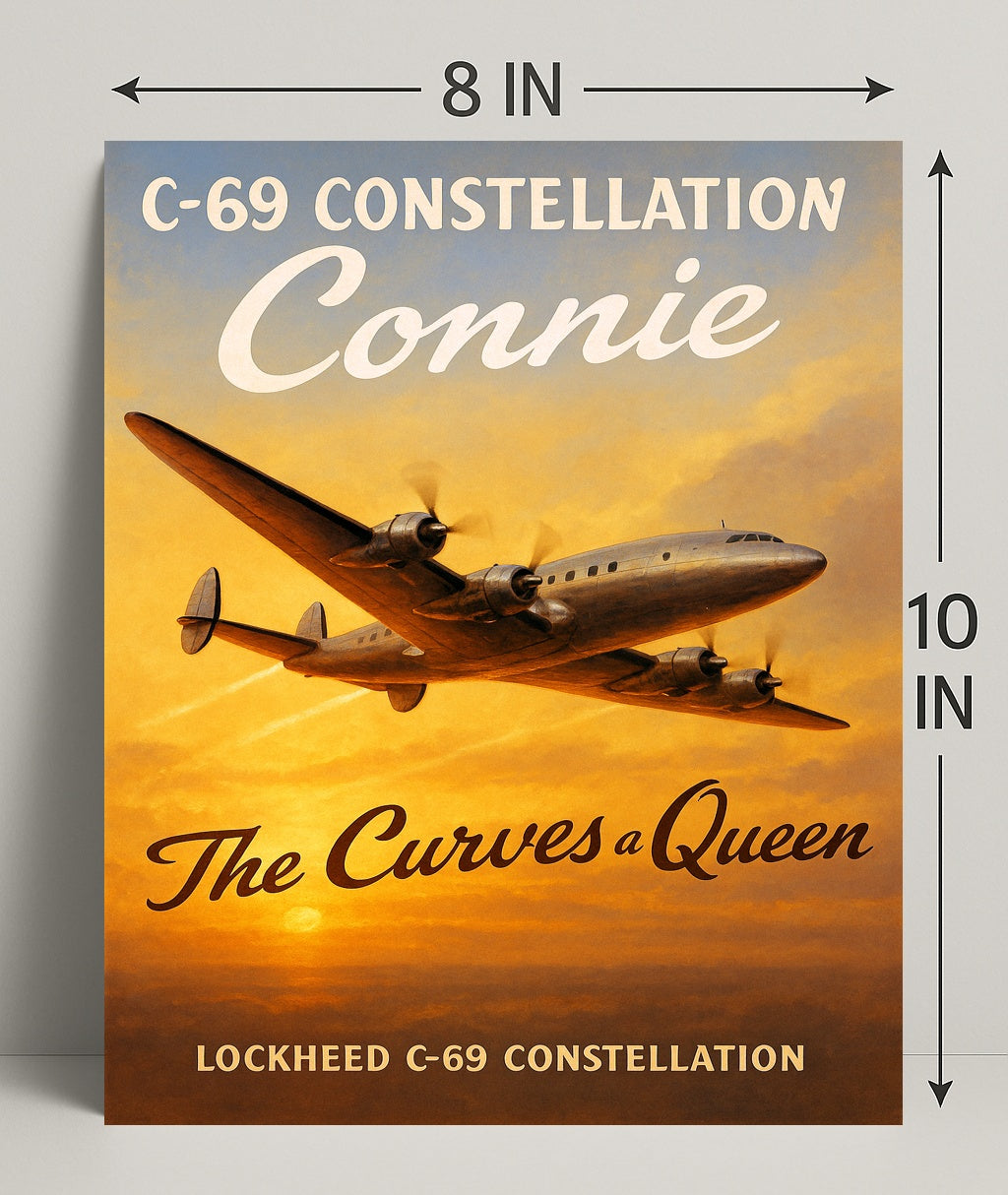 Design highlights: Detailed illustration of the Lockheed C-69 Constellation in flight, dramatic sunset background, retro lettering reading "Connie" and "The Curves a Queen".