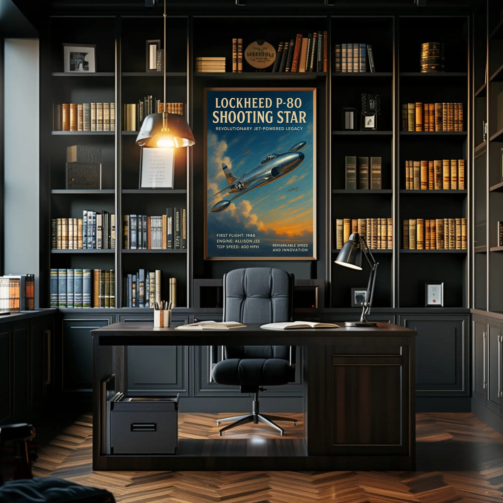 Lockheed P-80 Shooting Star Wall Art Print — a striking aviation poster from PosterGoat that captures the gleam of polished metal and the golden glow of sunset skies. This artful print celebrates the iconic P-80’s revolutionary jet-powered legacy with vintage-style typography and a dramatic, museum-quality illustration that commands attention in any room.