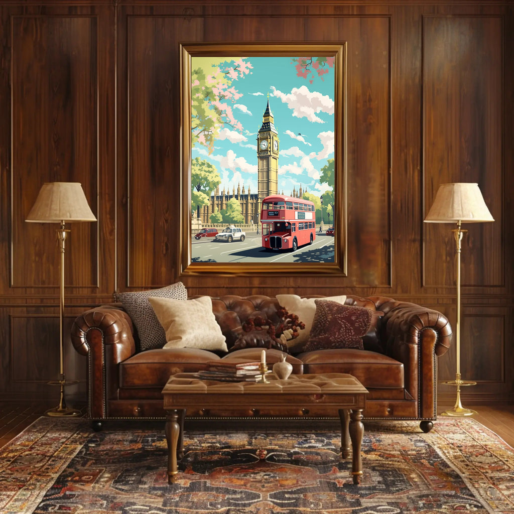 Vivid, calming palette: Soft turquoise sky, warm sandstone architecture and the iconic red bus create a balanced, eye-catching contrast ideal for living rooms, entryways, or workspaces.