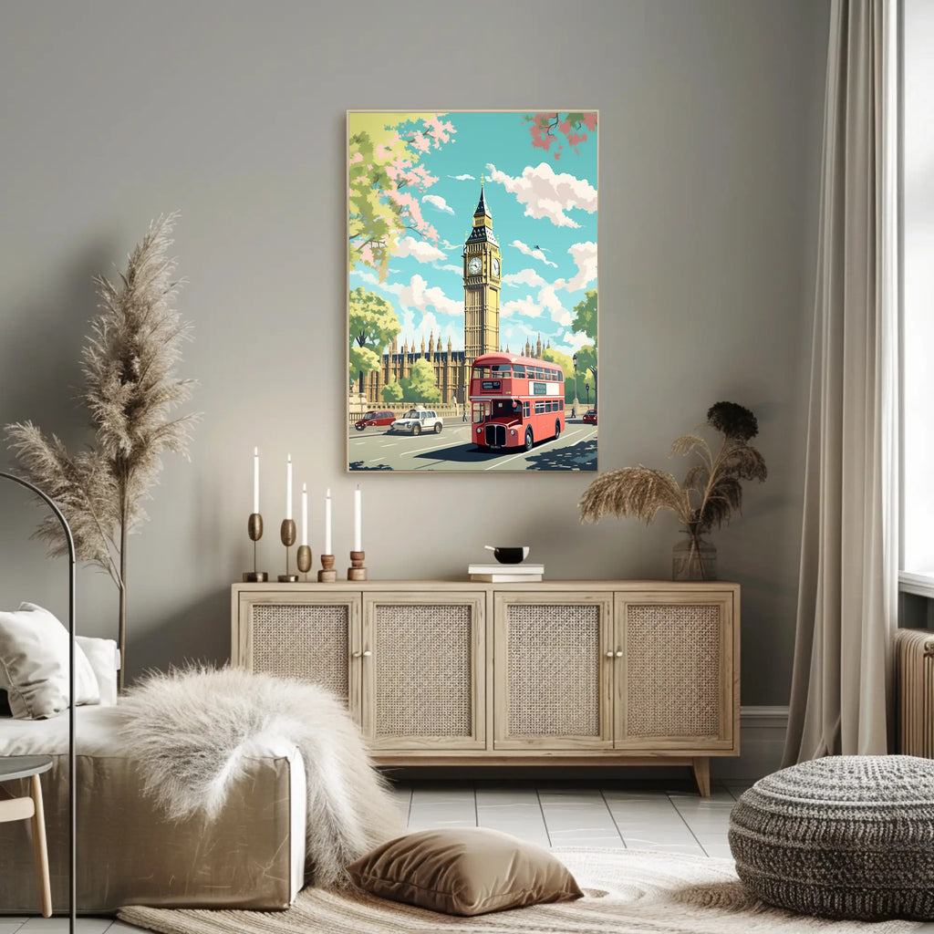 Bring the charm of London home with the London Iconic Scene Poster from PosterGoat — a minimalist, travel-inspired art print that captures Big Ben, a classic red double-decker bus, and a sunlit pastel sky in crisp, modern illustration. This scenic poster blends nostalgia and contemporary design to create a focal point that elevates any room in your home or office.