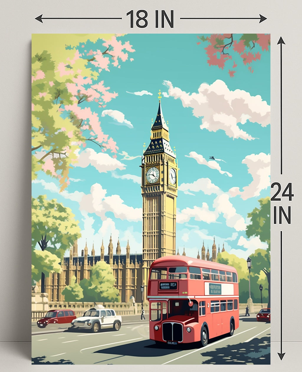 Striking landmark composition: Central depiction of Big Ben framed by leafy trees and fluffy clouds gives a sense of depth and cinematic scale.