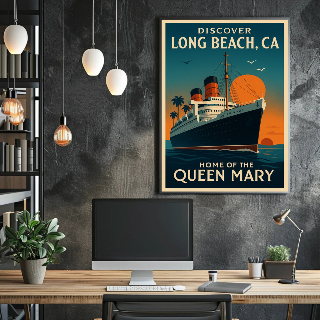 Iconic Imagery: Featuring the historic Queen Mary, this artwork resonates with maritime adventure and celebrates Long Beach’s rich history.