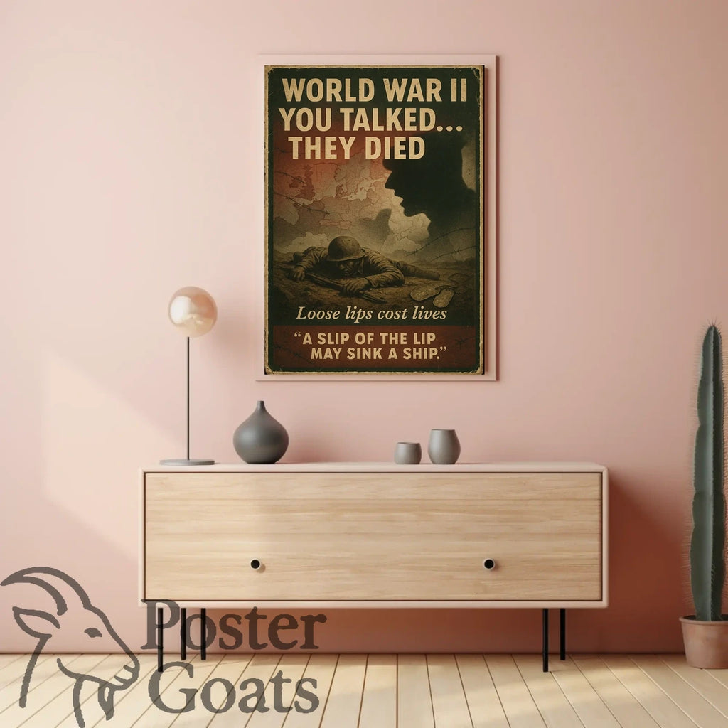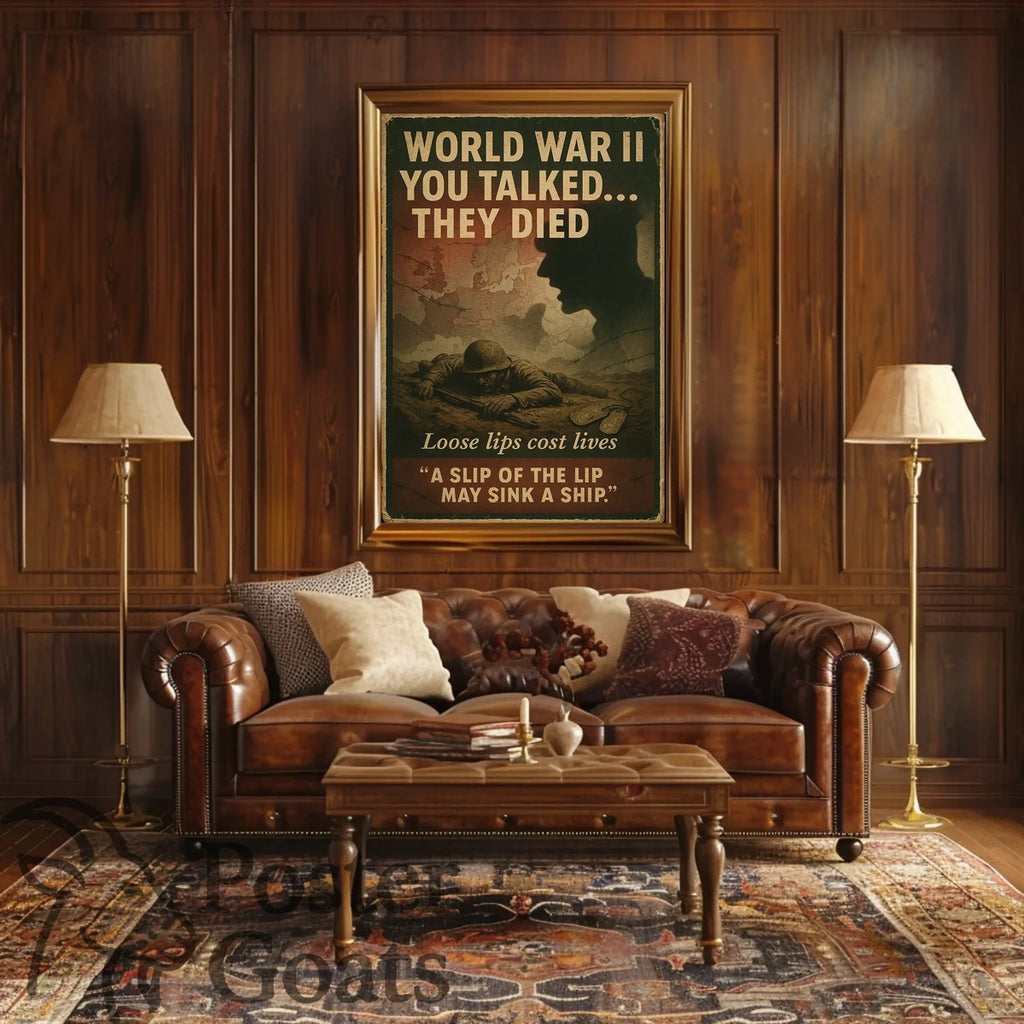 This striking World War II-era propaganda poster serves as a potent reminder of the importance of operational security and the dangers posed by careless talk. Featuring a silhouetted soldier's profile, a European map, and barbed wire, it captures the essence of mid-20th century American war propaganda. The inclusion of dog tags and the phrase "Loose lips sink ships" reinforces the serious and cautionary tone, emphasizing patriotic duty and the lethal consequences of unsecured information. This vintage piece is not only a historical artifact but also a powerful artistic expression of wartime vigilance.