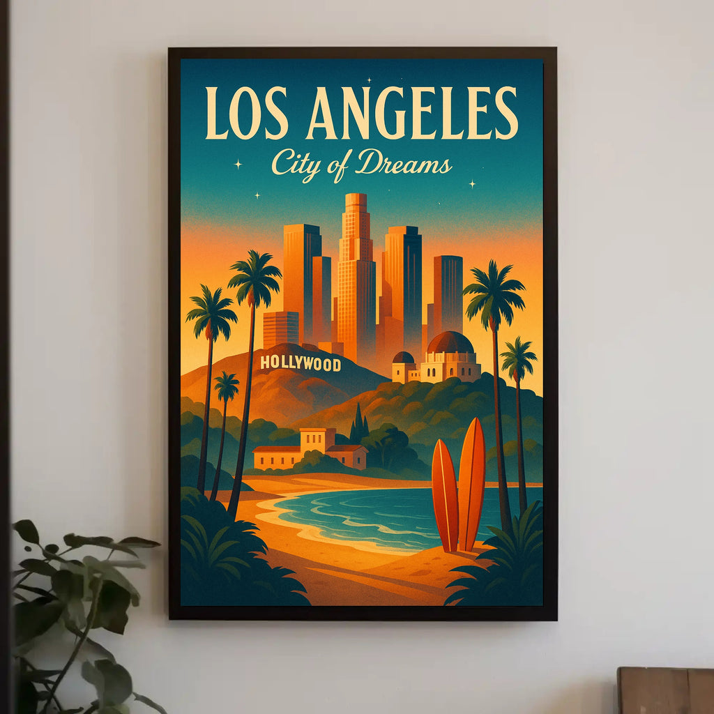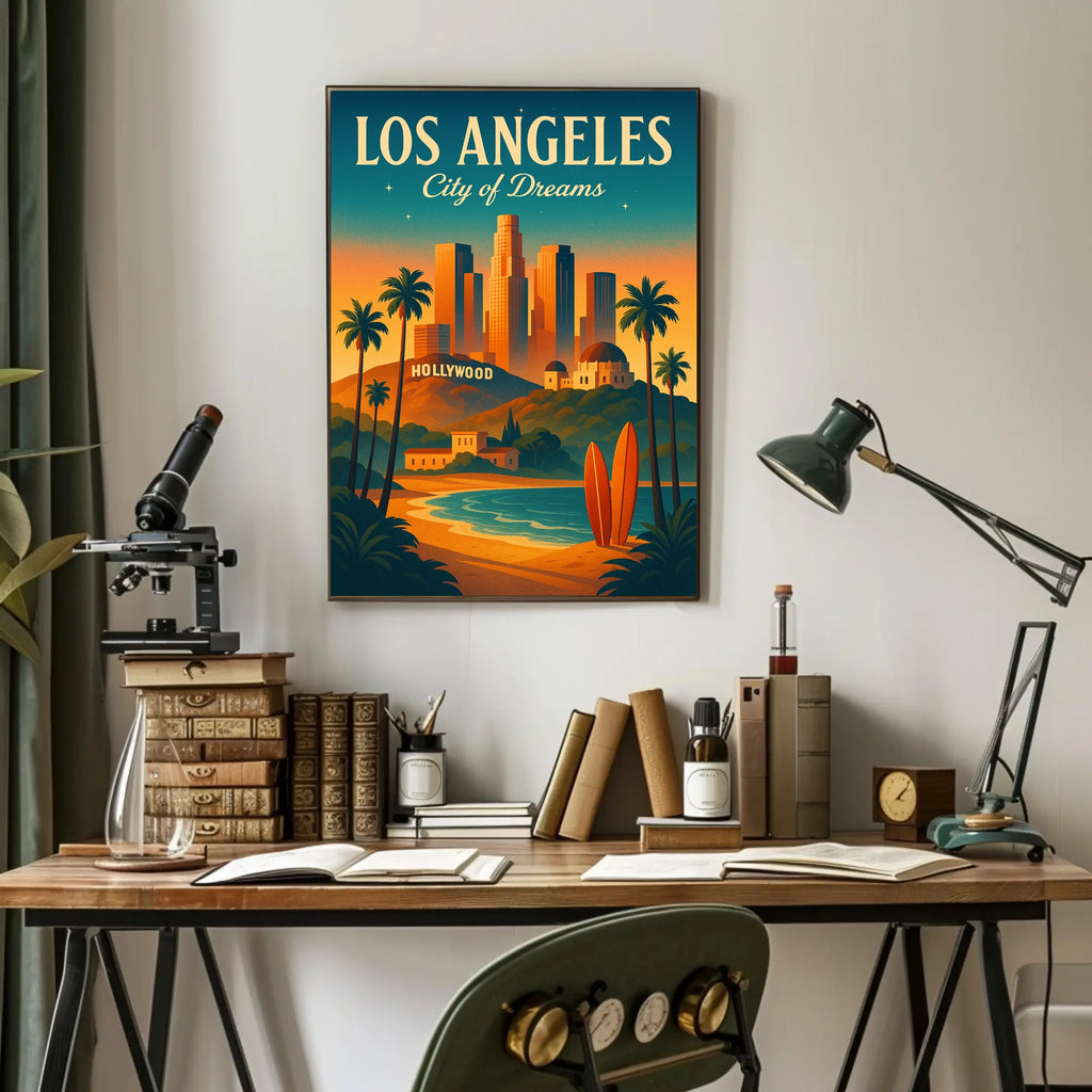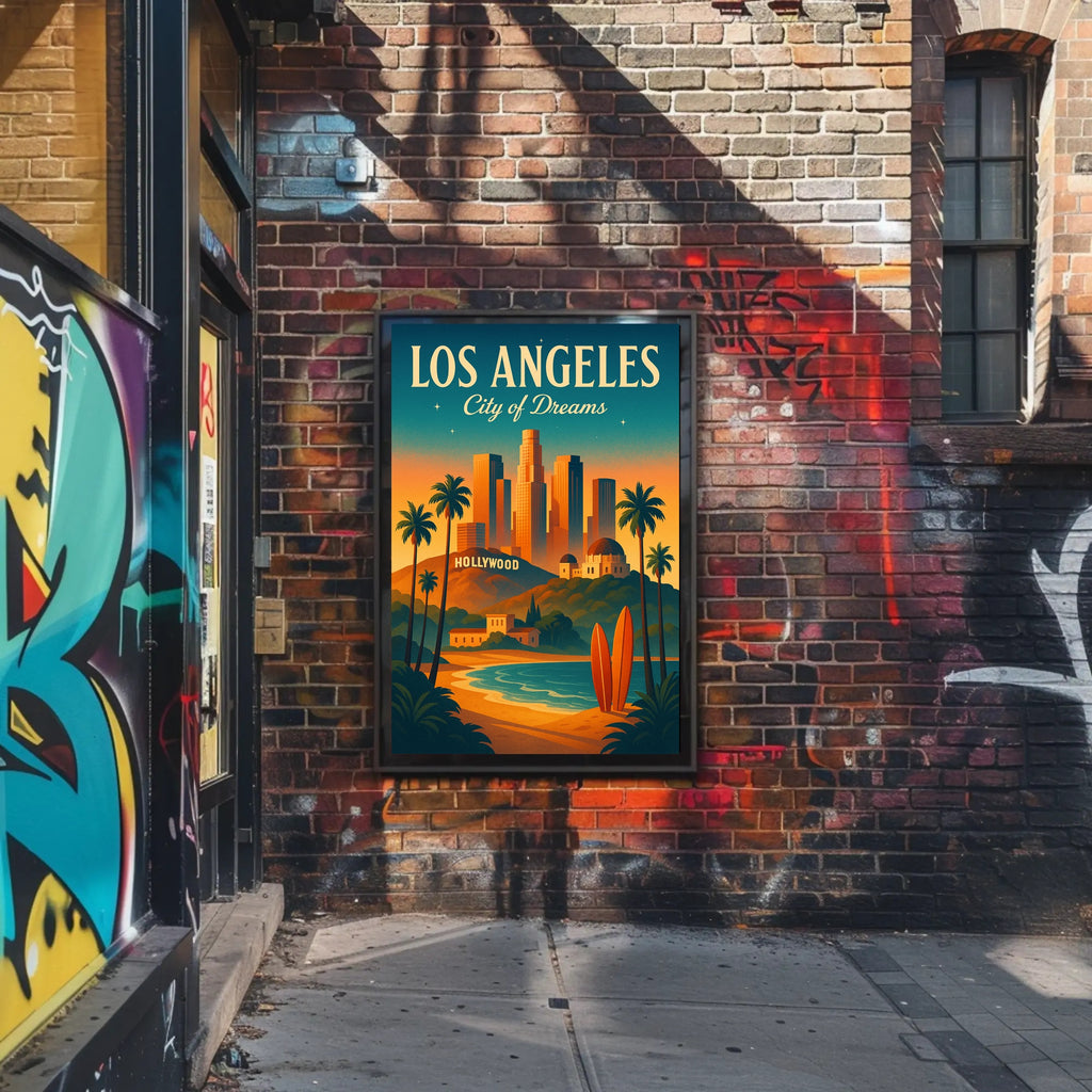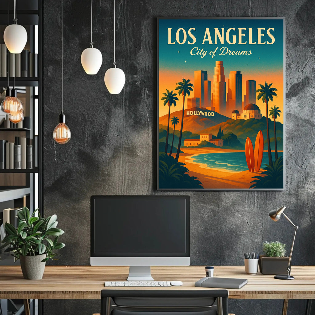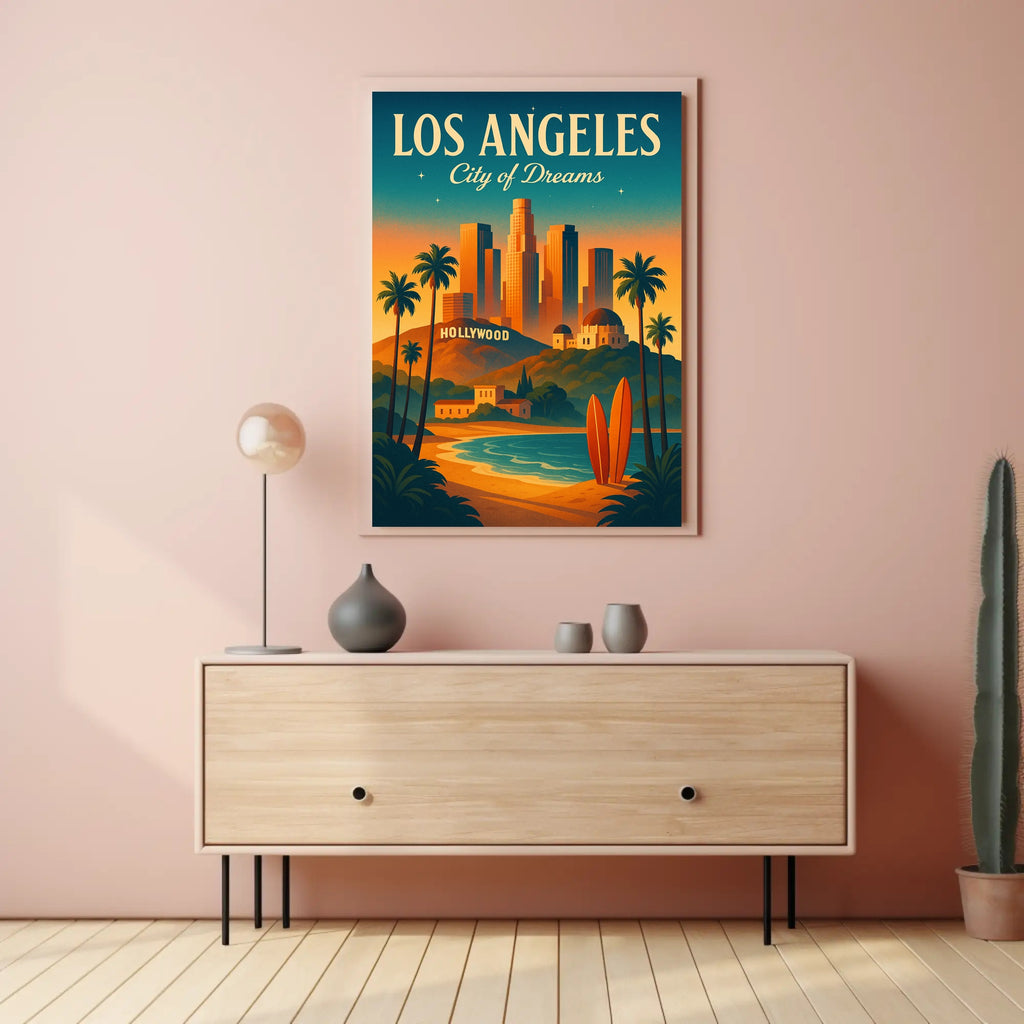 Transform your space with the Los Angeles Dreams Sunset Urban Cityscape Poster, a captivating piece that encapsulates the vibrant essence of the "City of Dreams." This artwork features a vintage-inspired portrayal of the iconic Hollywood sign, complemented by an art deco skyline and a nostalgic seaside backdrop. Perfect for those who cherish the allure of Southern California, this poster invites you to embrace a life filled with dreams and adventure.