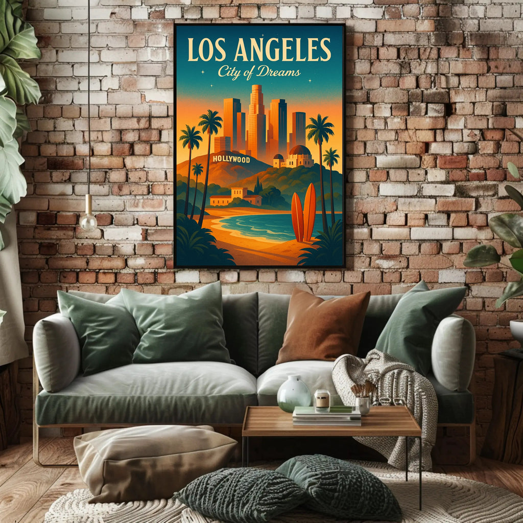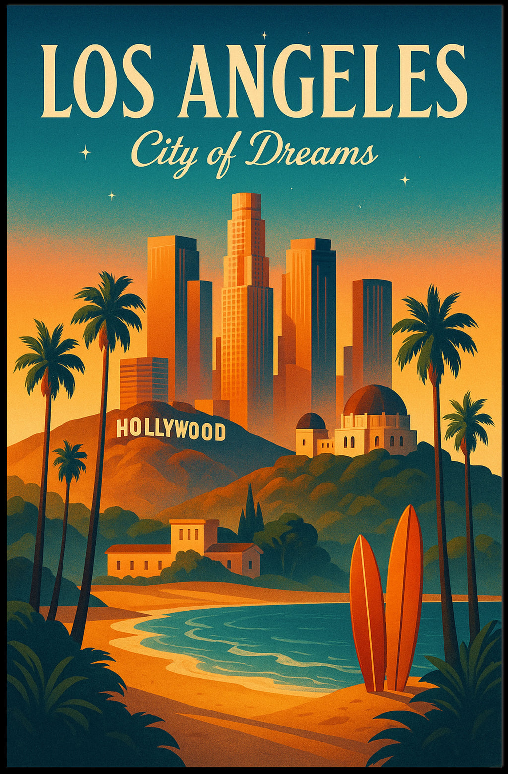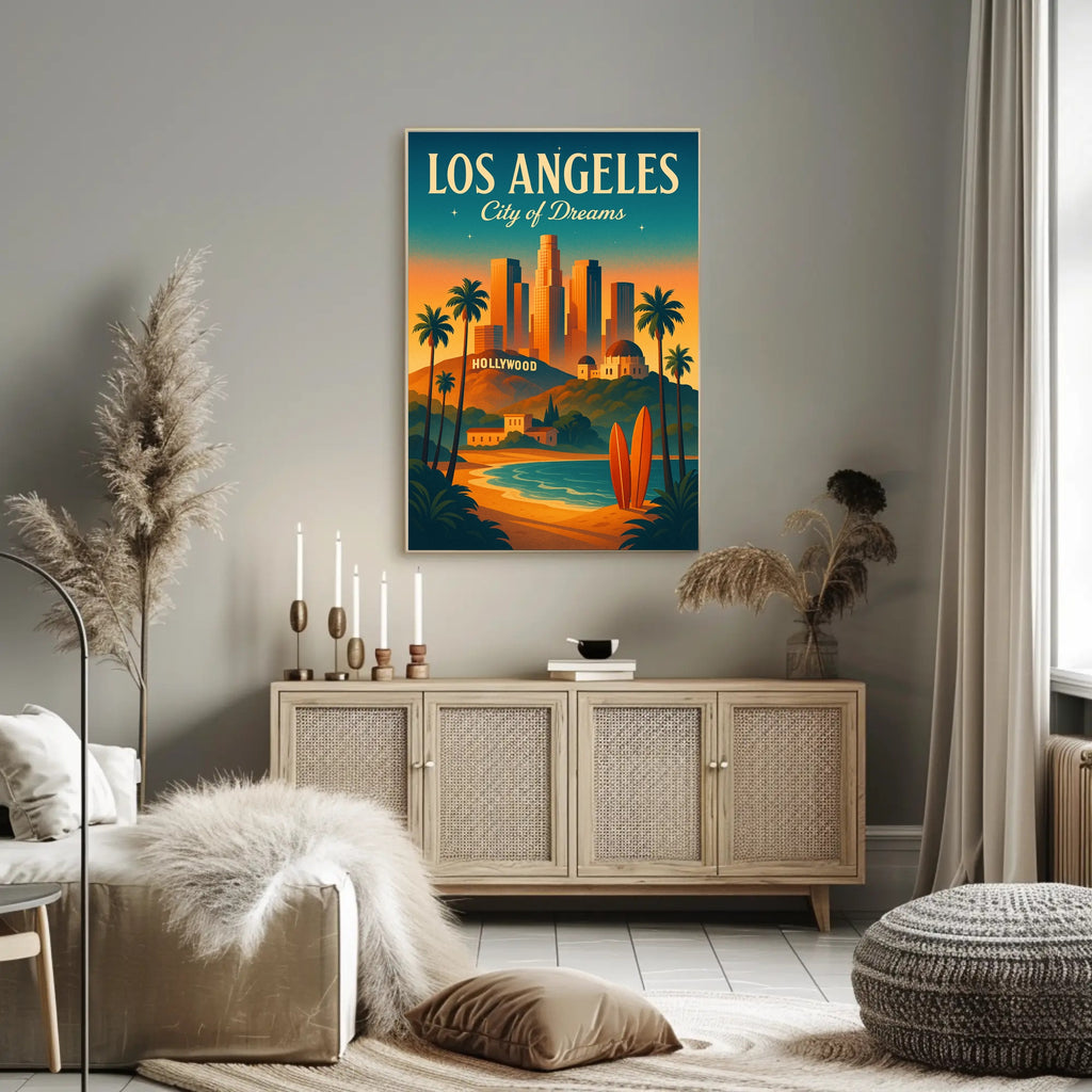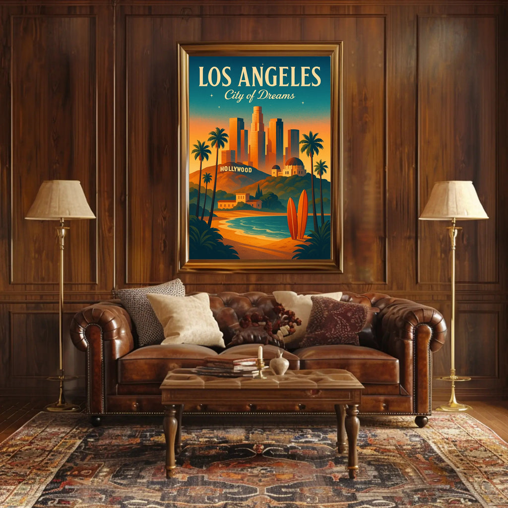 Transform your space with the Los Angeles Dreams Sunset Urban Cityscape Poster, a captivating piece that encapsulates the vibrant essence of the "City of Dreams." This artwork features a vintage-inspired portrayal of the iconic Hollywood sign, complemented by an art deco skyline and a nostalgic seaside backdrop. Perfect for those who cherish the allure of Southern California, this poster invites you to embrace a life filled with dreams and adventure.