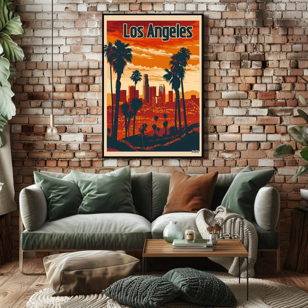Experience the allure of Los Angeles with this captivating poster, which elegantly highlights the city’s downtown skyline set against a backdrop of warm, sunset hues. The prominent palm trees in the foreground evoke a sense of classic Californian charm. Inspired by mid-century travel art, the piece blends vintage and retro aesthetics, offering a vibrant and inviting mood. Capturing the essence of Los Angeles, this poster is perfect for those who admire iconic cityscapes and glamorous urban landscapes. A stunning addition to any space, it speaks to the city’s timeless allure and artistic heritage.