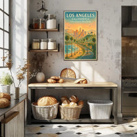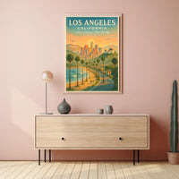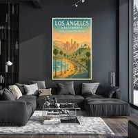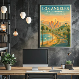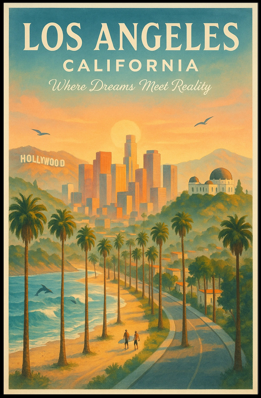 Detailed design highlighting the iconic LA scenery—from sunlit streets to the shimmering skyline—capturing its real-world charm
