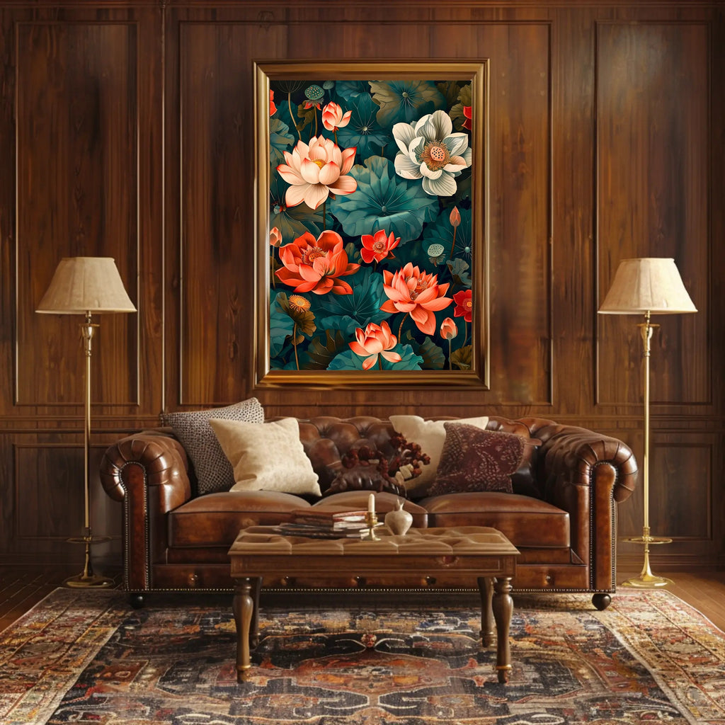 - Vibrant, museum-quality print: Rich, fade-resistant inks bring out the deep teal foliage and luminous lotus petals for a long-lasting visual impact.