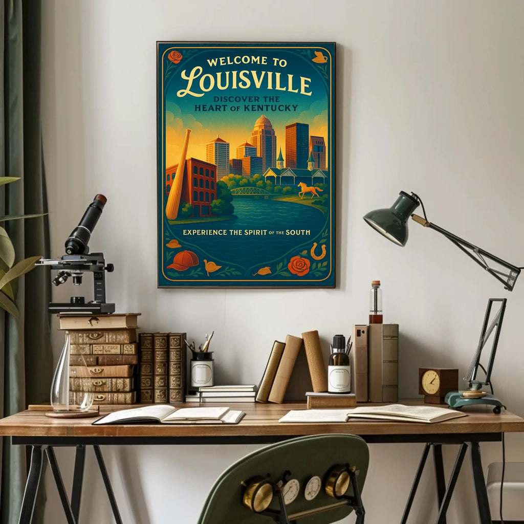 Louisville Heart of Kentucky Vintage Travel Poster — Discover the charm of Louisville, Kentucky with this beautifully crafted vintage travel poster. Capturing the essence of the “Heart of Kentucky,” it features a stylized cityscape adorned with iconic landmarks such as the Louisville Slugger baseball bat and a spirited horse, symbolic of the Kentucky Derby. The flowing river, roses, and horseshoe accents further enhance its cultural richness. Rendered in warm, inviting colors with a classic retro vibe, this poster is a celebration of Louisville’s vibrant southern culture, welcoming spirit, and proud traditions. Perfect for enthusiasts of both travel and historical art.