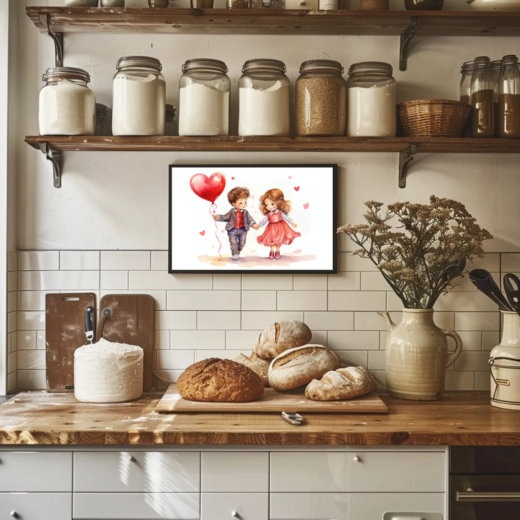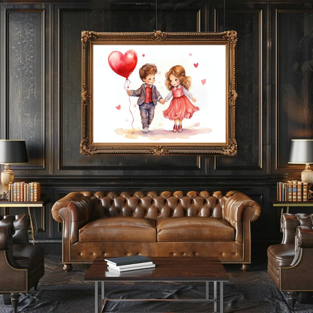 Delight your walls with the whimsical charm of the Love in the Air Poster by PosterGoat — a heartwarming watercolor-style print that captures a sweet moment between two children holding hands as a glossy heart-shaped balloon drifts above. Soft washes of pink and red, delicate brush textures and minimalist composition make this romantic print an elegant focal point for living rooms, nurseries, cafes, or cozy corners where positive vibes matter.