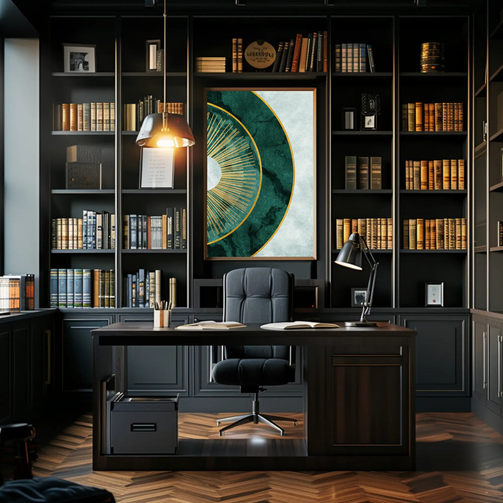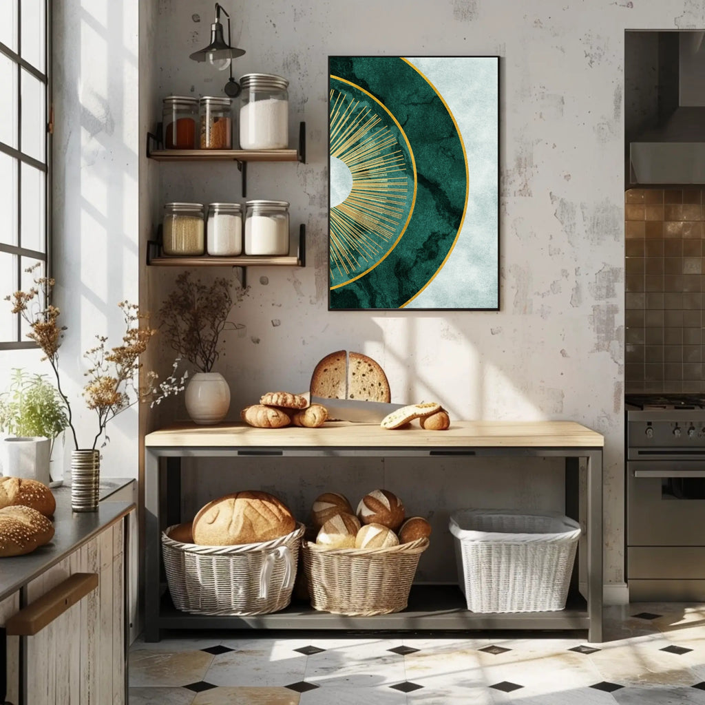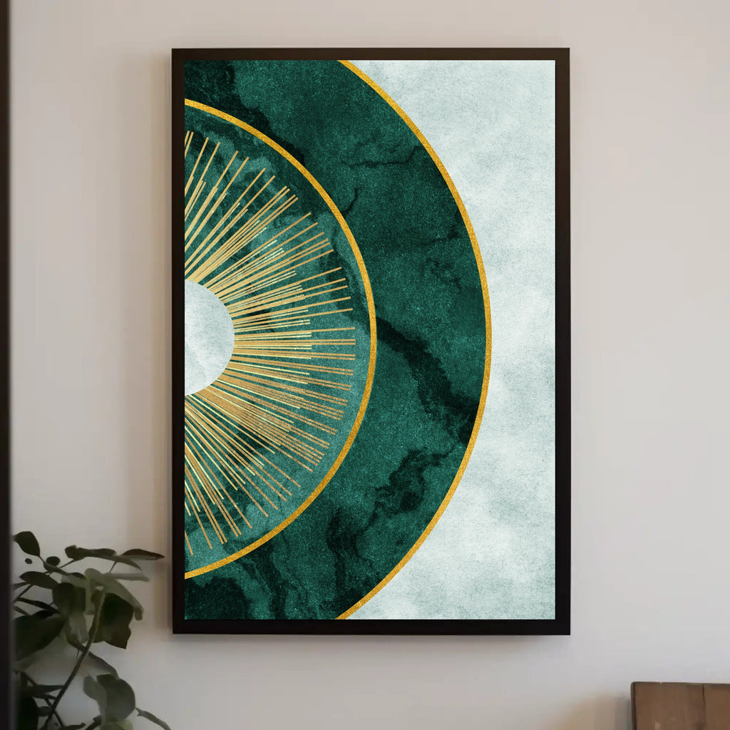 Elevate your space with this stunning abstract poster, featuring a mesmerizing design that combines modern minimalism with decorative elegance. At the center, a pristine white circle emerges, surrounded by golden radial lines that mimic the radiant beauty of the sun's rays. This captivating centerpiece is set against a textured, marbled dark green background, gracefully framed by a thin golden border. The luxurious and sophisticated theme of this poster makes it a perfect addition to any room, effortlessly enhancing your décor with its unique blend of simplicity and opulence.