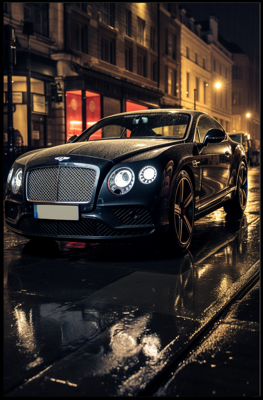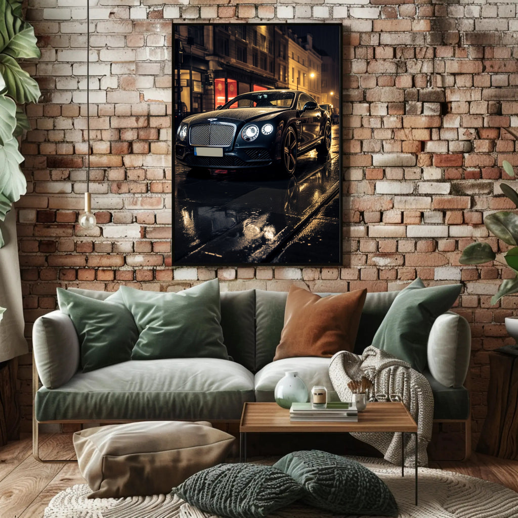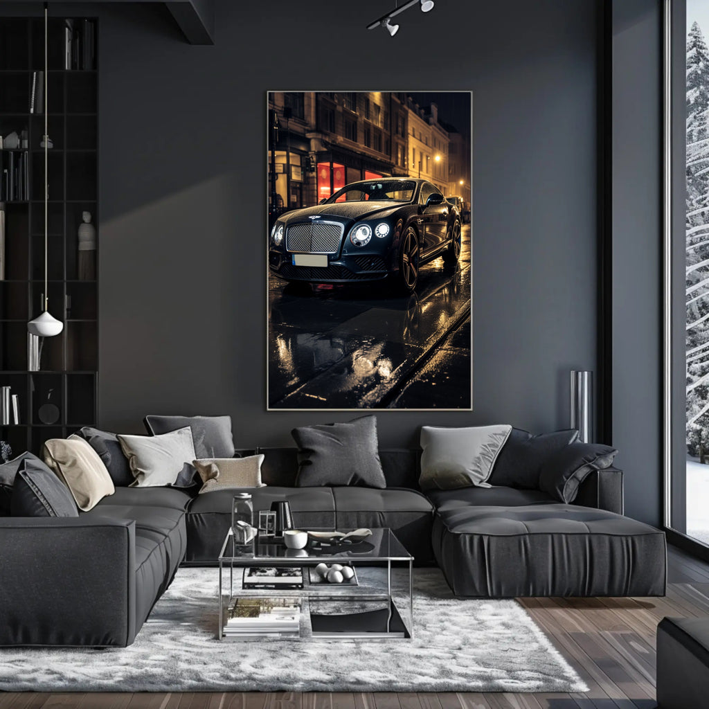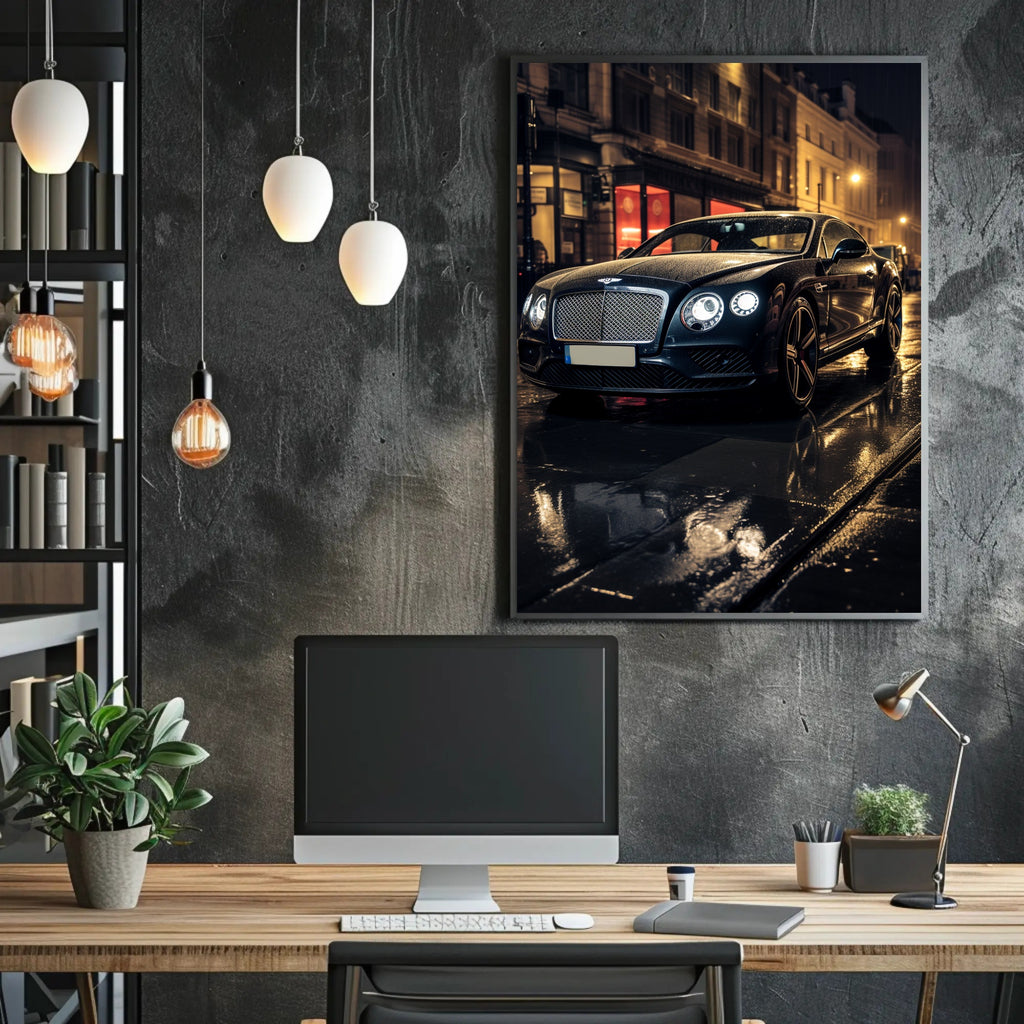 This poster blends modern minimalist style with automotive photography to create a sophisticated focal point for any room. The image highlights the car’s iconic mesh grille, glowing circular headlights, sculpted body lines and the wet pavement’s mirror-like reflections, evoking motion, mystery, and metropolitan elegance.