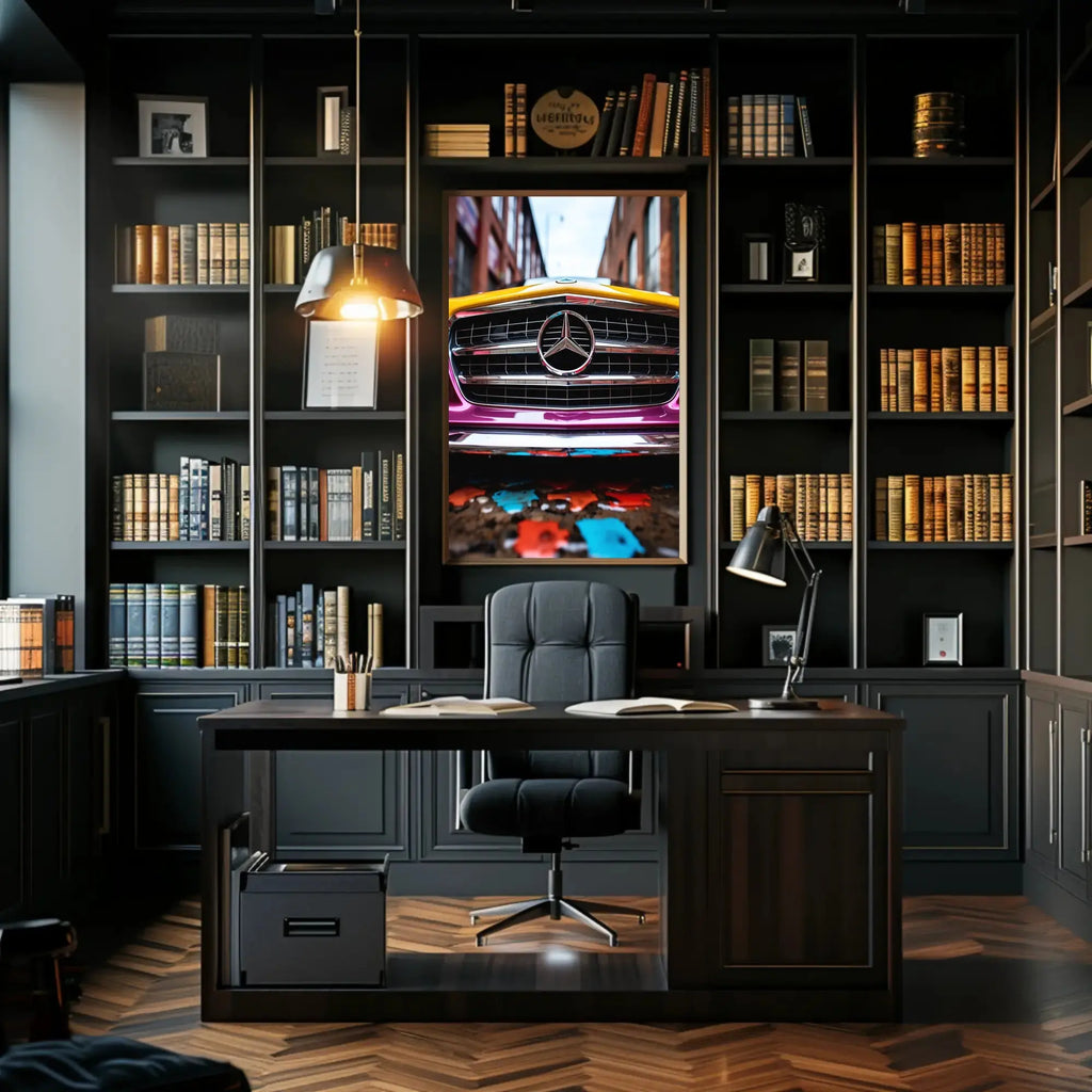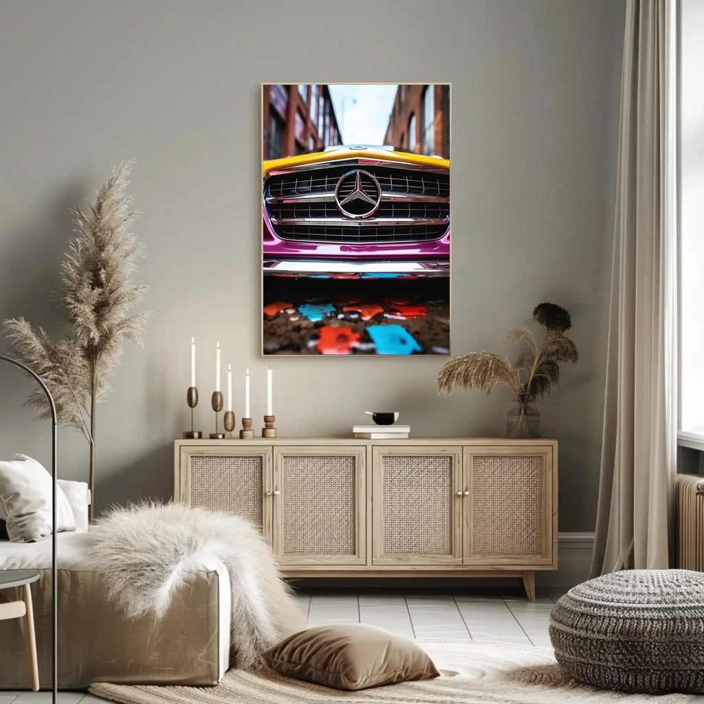 Bring high-octane luxury and bold contemporary art into your space with the Luxury Mercedes-Benz Urban Vivid Art poster by PosterGoat. This striking close-up of a Mercedes-Benz front grille is transformed into a pop‑art statement piece, rendered in vivid yellow and pink tones against an atmospheric urban alley — chrome details gleam while colorful paint splatters on the pavement add dynamic contrast.