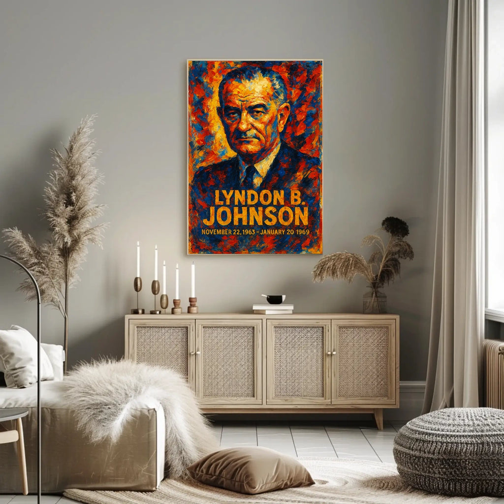 Immerse your space in a glitch-inspired portrait that reimagines the presidency of Lyndon B. Johnson. This eye-catching piece blends history with modern art, making it a standout addition for fans of american politics, history, and vintage wall art.