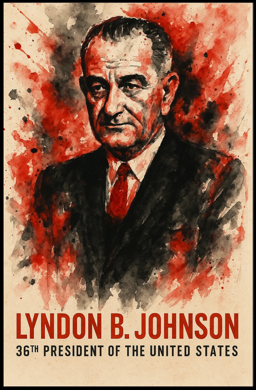 Embrace history with this stunning watercolor artwork of President Lyndon B. Johnson. The design's bold red, black, and beige tones capture the powerful legacy and era of the 36th President of the United States. This artistic poster is perfect for enthusiasts of American history or devotees of political memorabilia. Its unique watercolor effect brings a sense of vintage charm and elegance, making it an ideal addition to any home or office decor. Highlight your passion for remarkable leadership and enhance your space with this compelling portrait that bridges history with artistic flair.