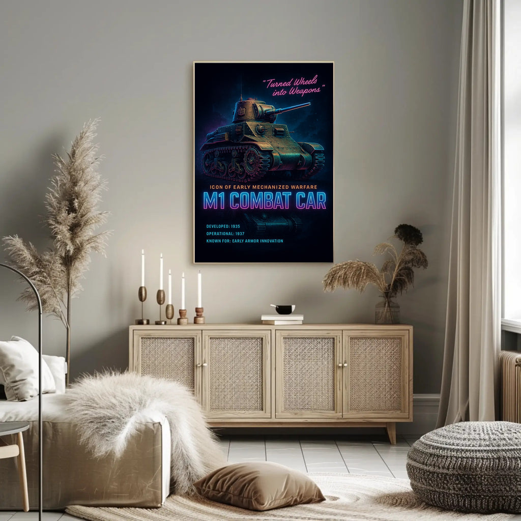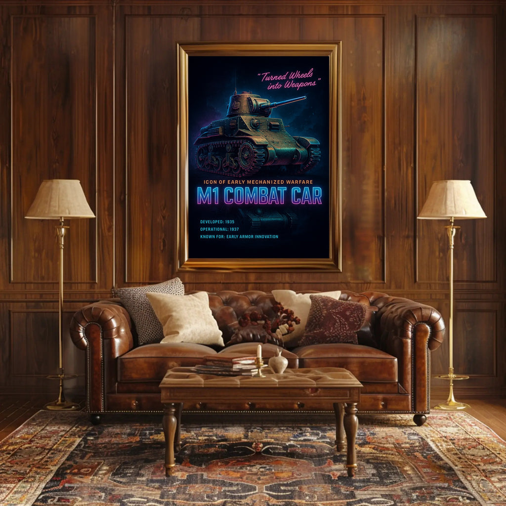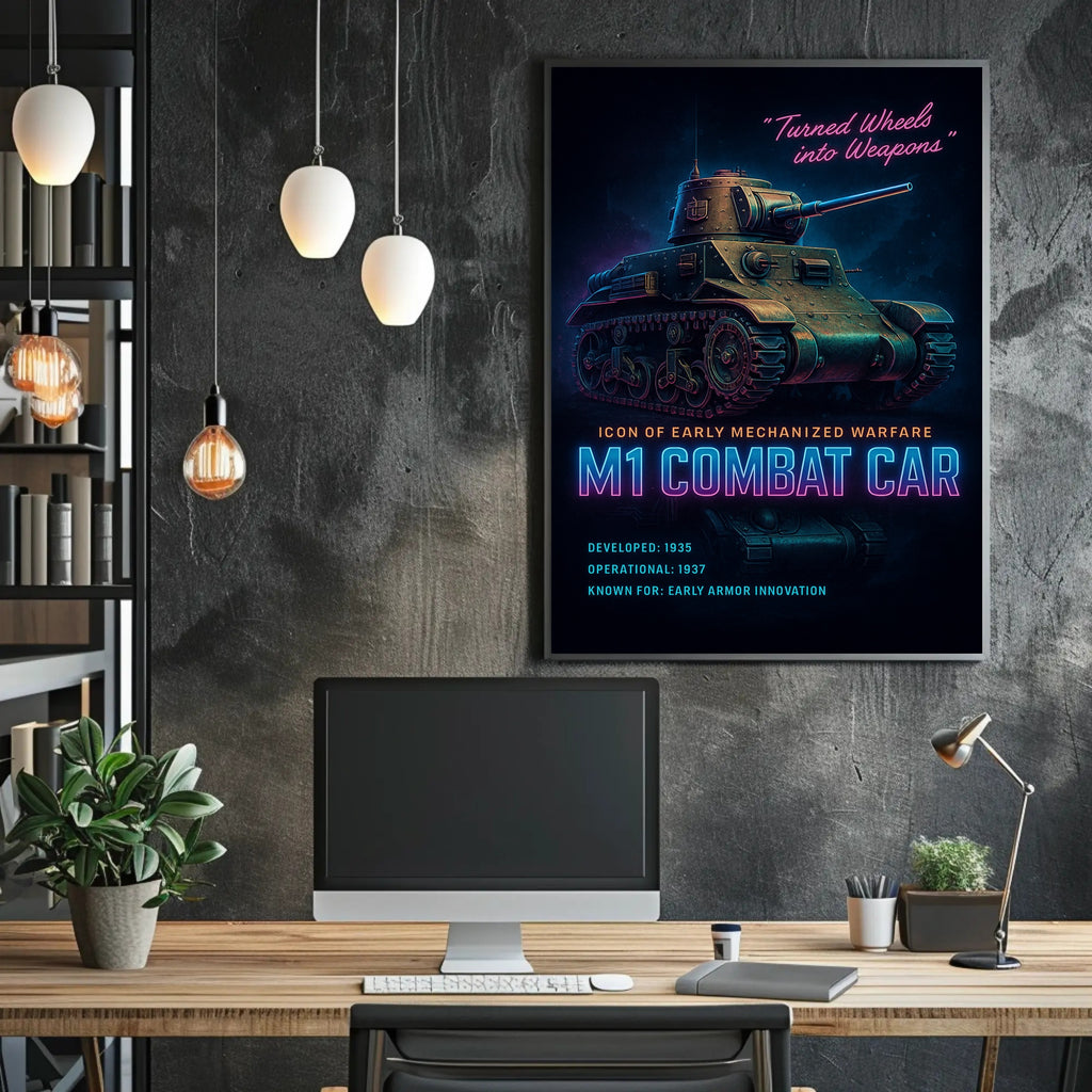PosterGoat presents: the M1 Combat Car Poster — a striking pop-art tribute to the icon of early mechanized warfare. Richly detailed and illuminated with neon-inspired accents, this poster blends historical spirit with modern aesthetic for a standout piece of wall art.