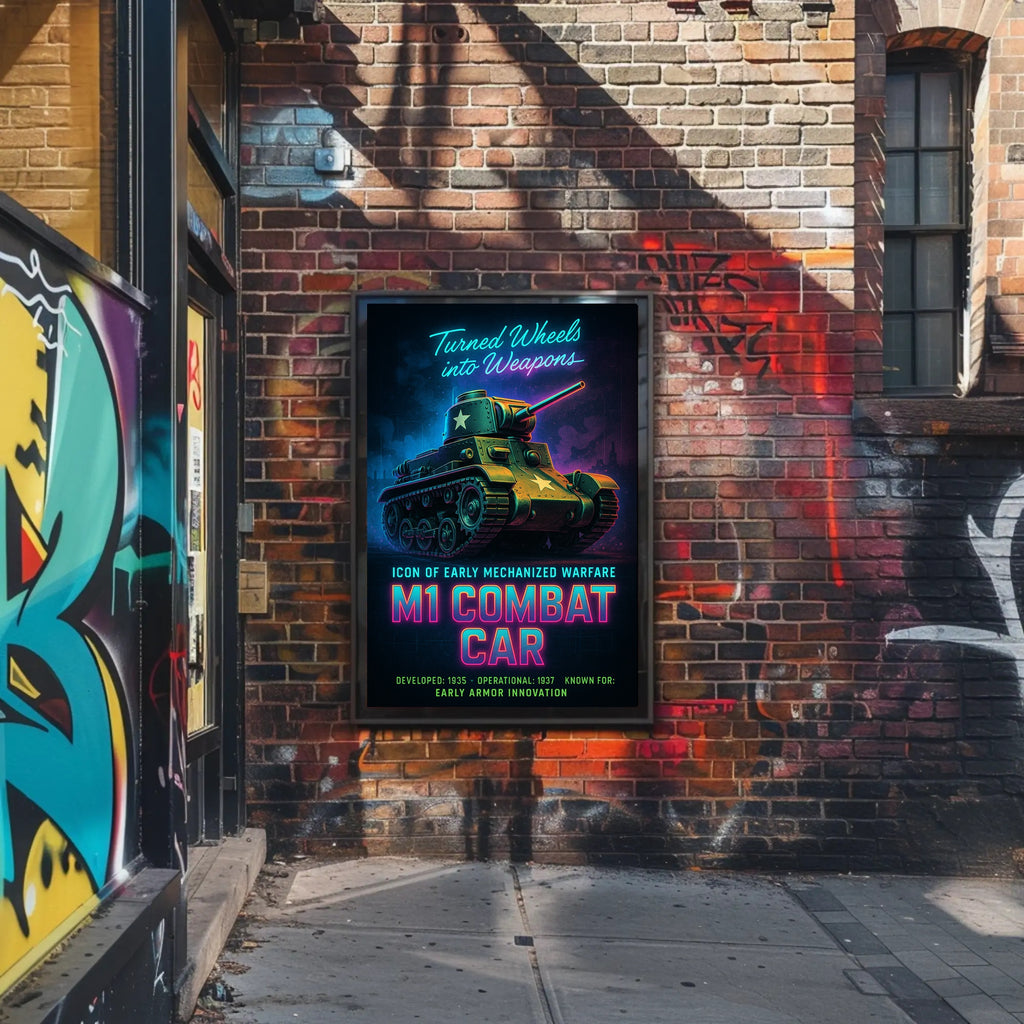 M1 Combat Car — Icon of Early Mechanized Warfare is a bold art poster from PosterGoat that transforms military history into eye-catching home decor. This 18x24 poster features a striking, neon-infused illustration of the classic M1 combat car under moody, atmospheric lighting, complete with star insignia and retro script reading “Turned Wheels into Weapons.” Perfect for collectors, history buffs, and anyone who wants a standout piece in their Posters & Prints collection.