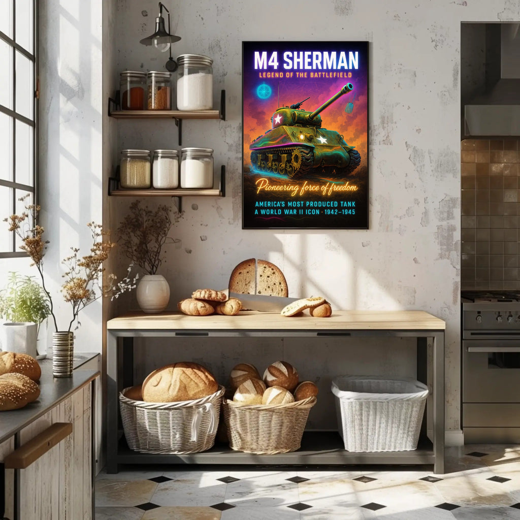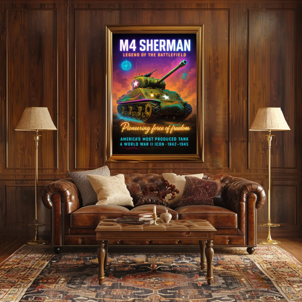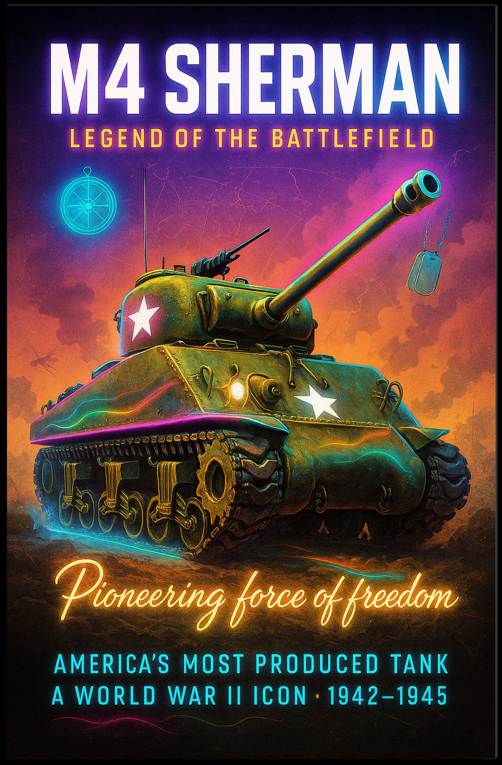 Bring home a striking piece of wartime nostalgia with the M4 Sherman - Legend of the Battlefield poster by PosterGoat. This high-impact poster blends vintage military iconography with bold, neon-infused illustration—featuring a resolute M4 Sherman tank, glowing star markings, suspended dog tags and a compass motif—designed to become the centerpiece of any decor collection.