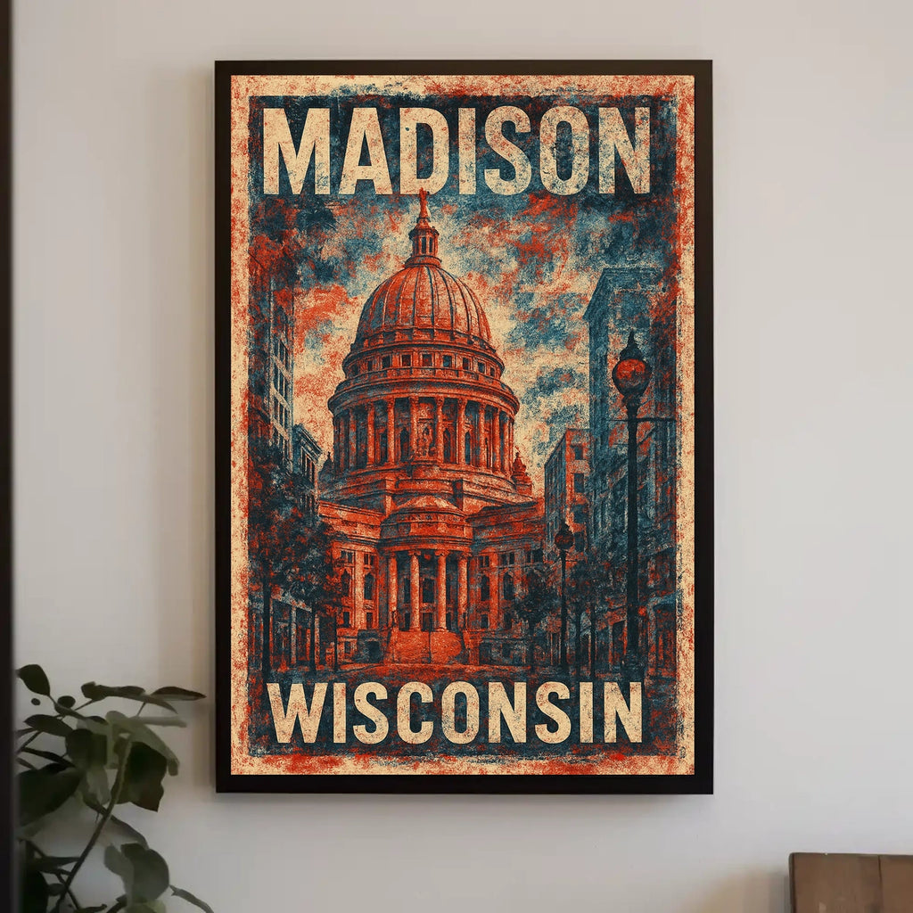 Capture the essence of Madison, Wisconsin with this stunning vintage-style poster featuring the iconic Wisconsin State Capitol building. The design nods to classic travel posters, infusing a nostalgic retro aesthetic with grainy textures that evoke the charm of yesteryear. The rich palette of warm reds and cool blues enhances the bold and patriotic ambiance, while the dome and columns resonate with civic pride and historical significance. Urban scenes with street lamps and nearby buildings complement the composition, making it an ideal piece for those who treasure Madison's cultural heritage.
