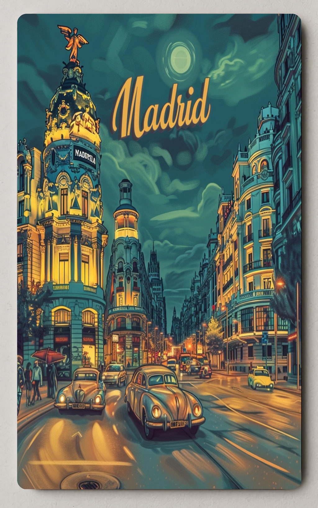 This striking trading card features a retro pop-art interpretation of Madrid’s skyline: ornate architecture bathed in golden streetlight, classic cars cruising a reflective avenue, and a swirling, moody night sky that gives the scene cinematic depth. The artwork blends nostalgia with modern urban energy to create a piece that stands out in any collection or display.