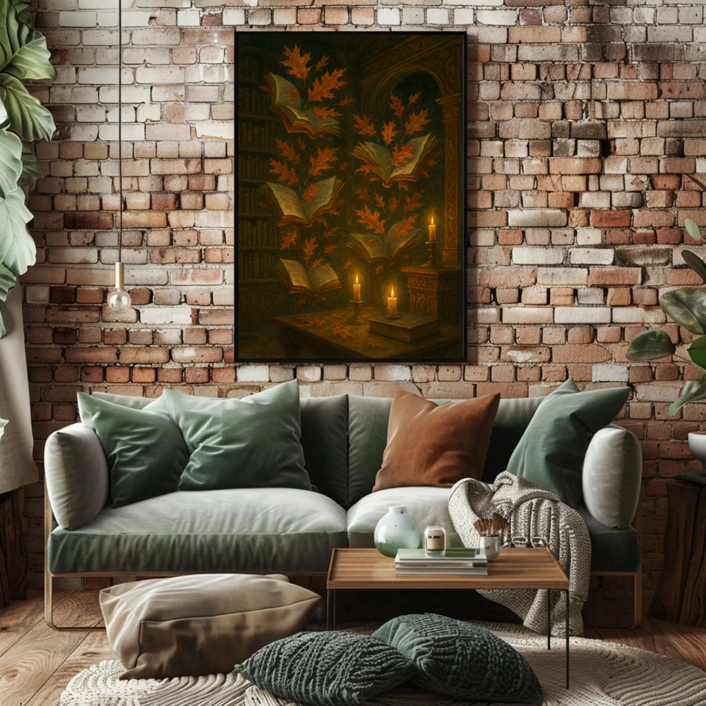 Detailed design highlighting the surreal library scene—open books float gracefully amidst a cascade of autumn leaves, softly illuminated by candlelit glow