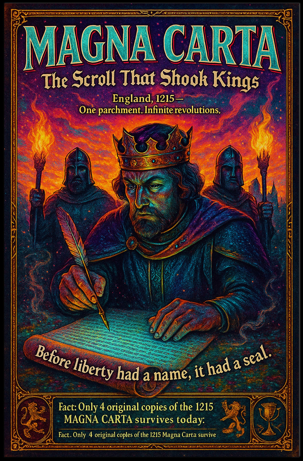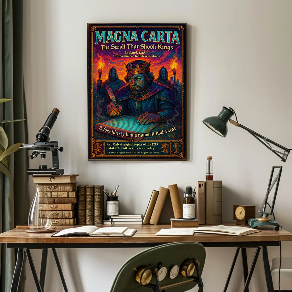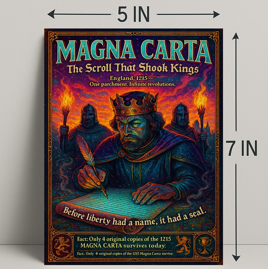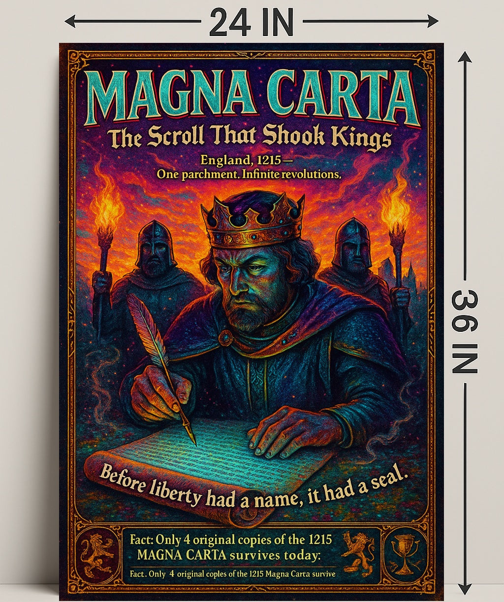 Bring history and drama to your walls with the "Magna Carta — The Scroll That Shook Kings" poster from PosterGoat. This richly detailed artwork captures a crowned monarch hunched over a parchment, quill in hand, flanked by torch-bearing guards — a powerful visual tribute to the birth of liberty and the enduring impact of the 1215 Magna Carta.