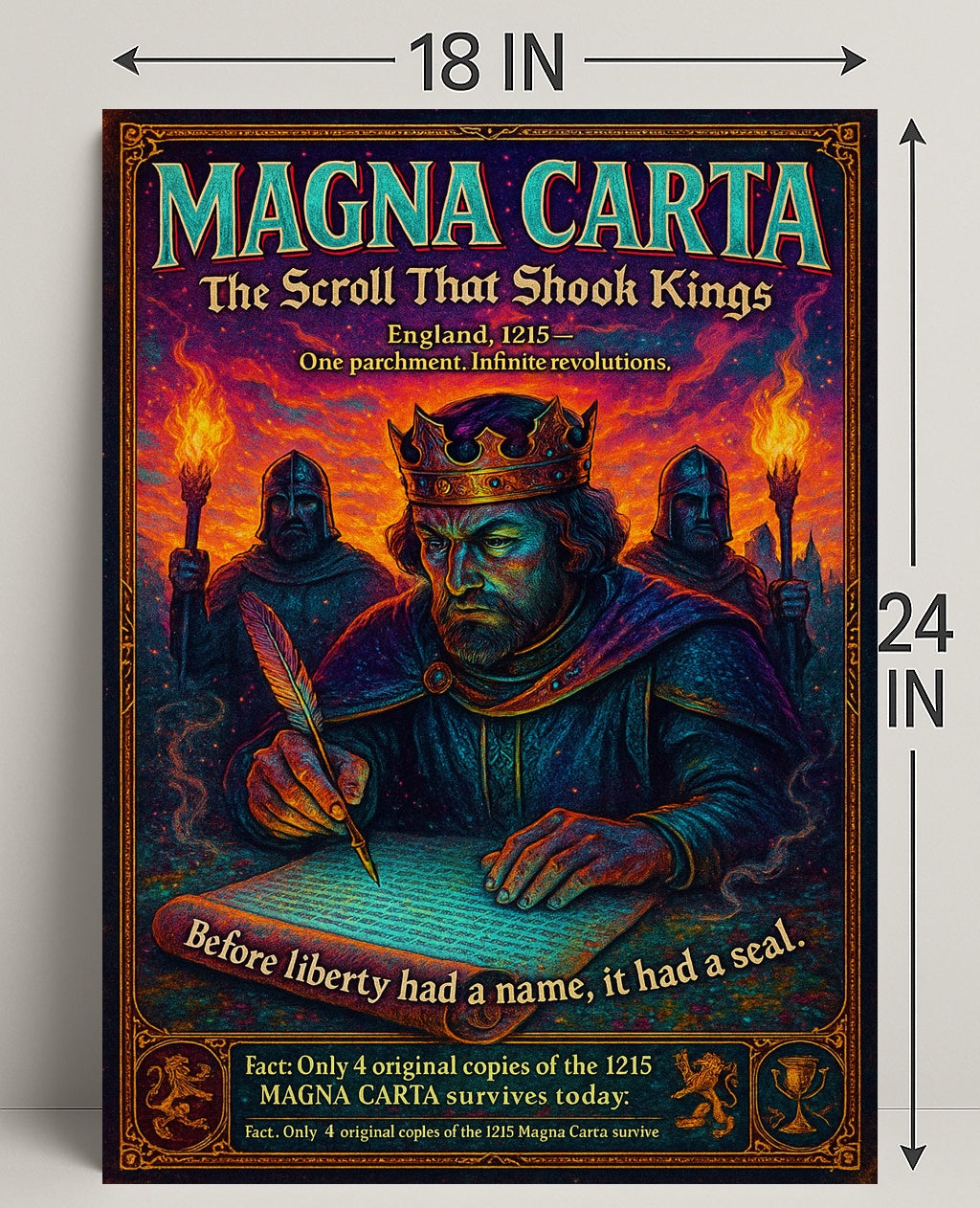- Historical appeal: The poster highlights the iconic tagline visible in the artwork — "Before liberty had a name, it had a seal" — and the intriguing fact that only four original 1215 Magna Carta copies survive today, adding educational value and conversation-starting detail.