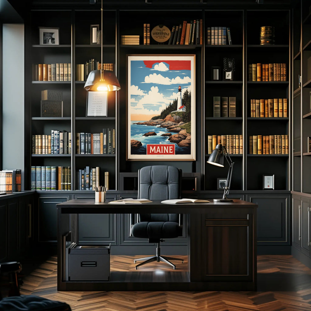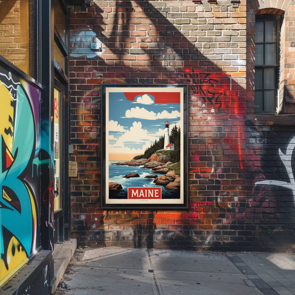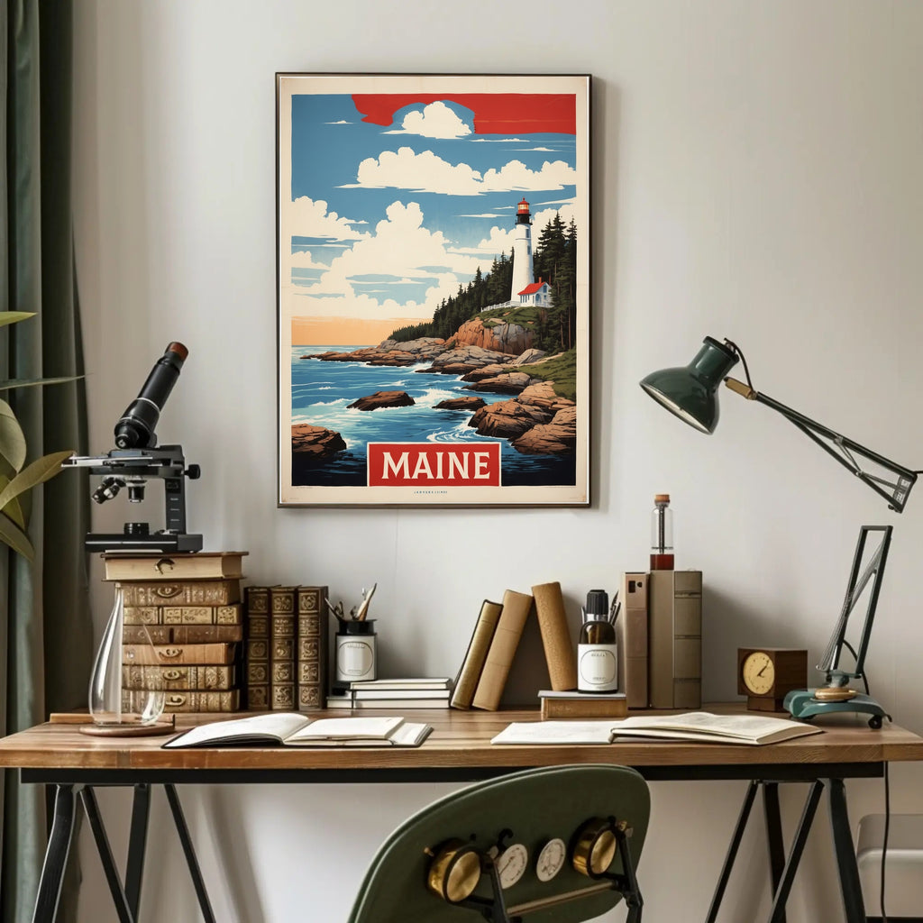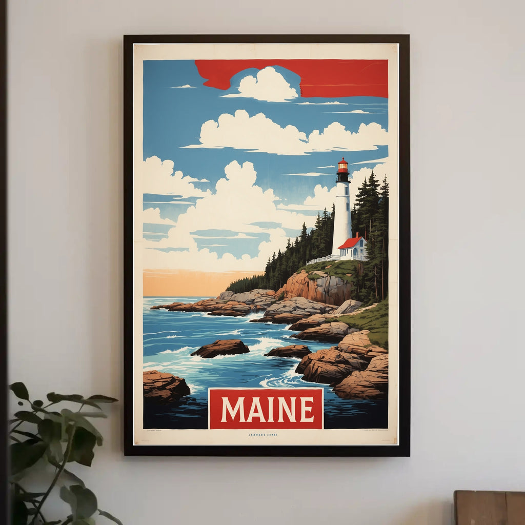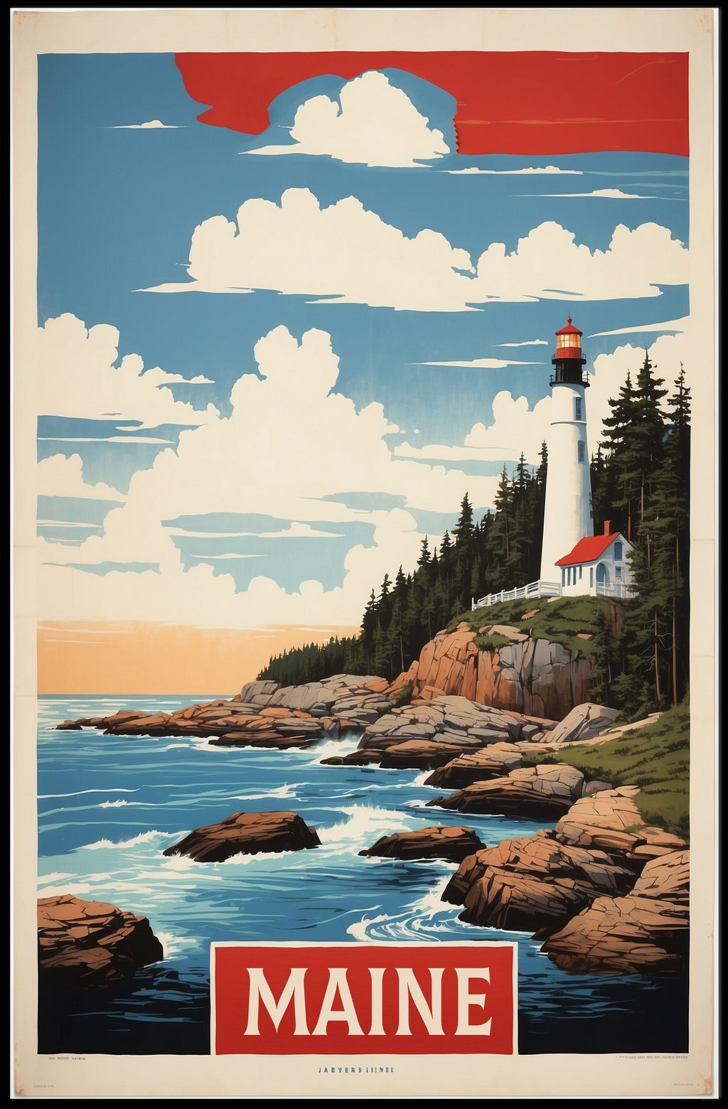 Experience the mesmerizing charm of Maine with our stunning vintage poster, showcasing a classic white lighthouse majestically perched on rugged cliffs. Enveloped by dense evergreen forests and set against a vibrant red roof, this scene captures the natural beauty and maritime spirit of the coastal region. The dynamic ocean waves crashing against the rocky shore, combined with a sky filled with fluffy clouds on a clear, breezy day, evoke a sense of adventure and tranquility. Perfect for those who appreciate the timeless appeal of vintage travel art and the picturesque allure of coastal landscapes.