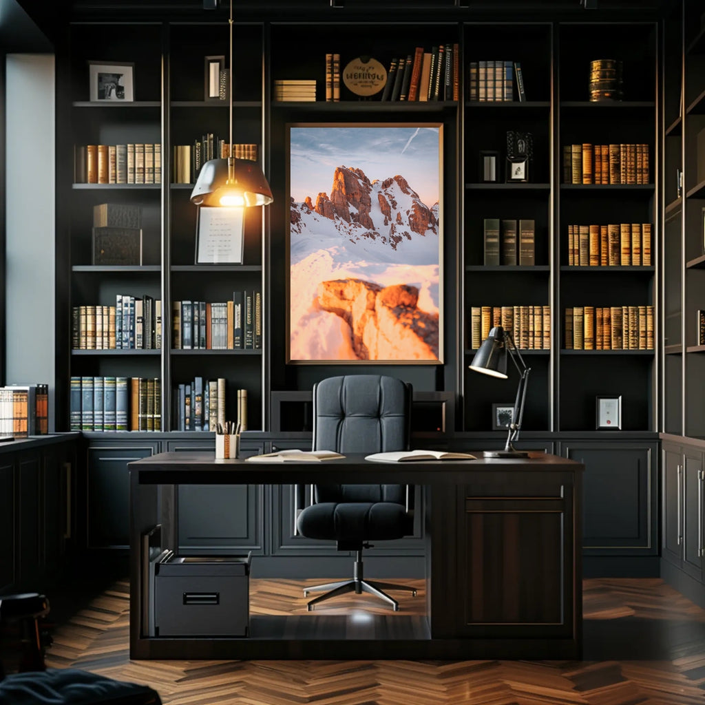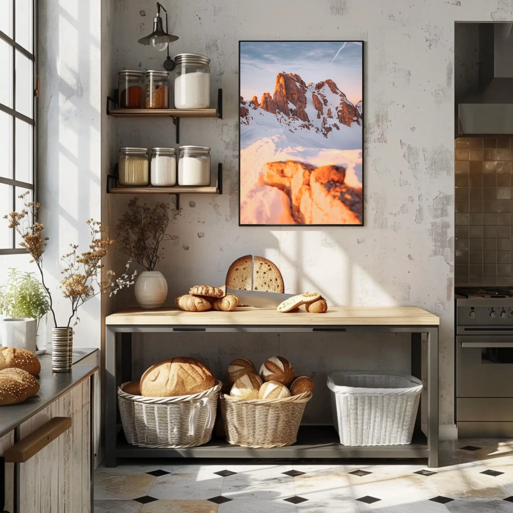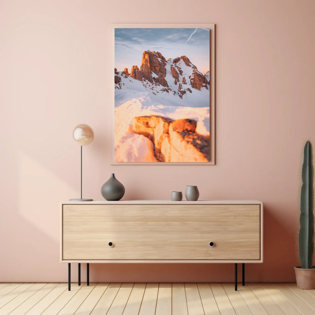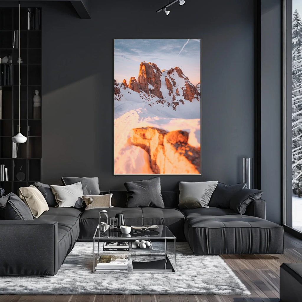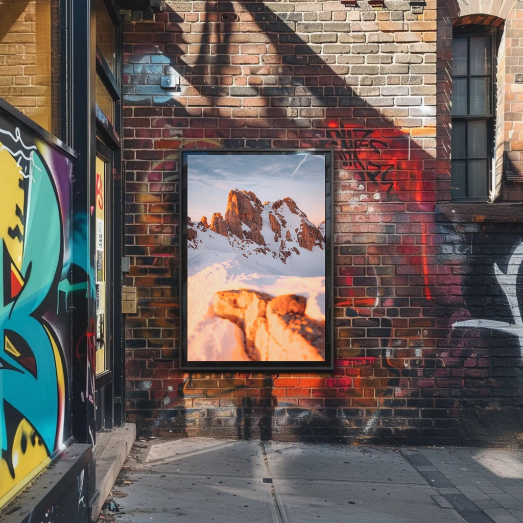 This photorealistic poster immerses you in alpine wilderness: snow-covered rocky peaks rise beneath a warm, golden sunrise, creating a tranquil yet powerful panorama. The sharp contrast of sunlight against the cool snow evokes a serene mood reminiscent of the Dolomites or similar mountainous regions.