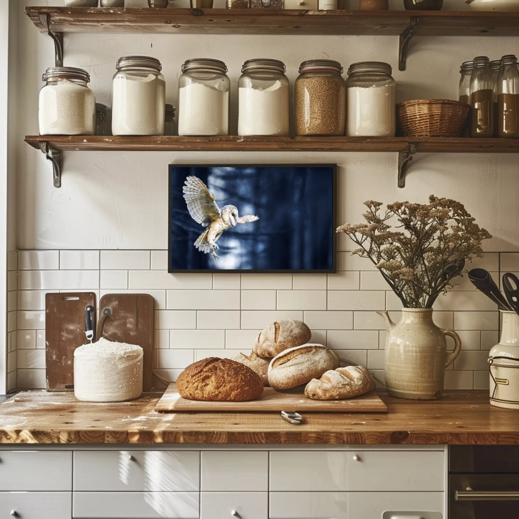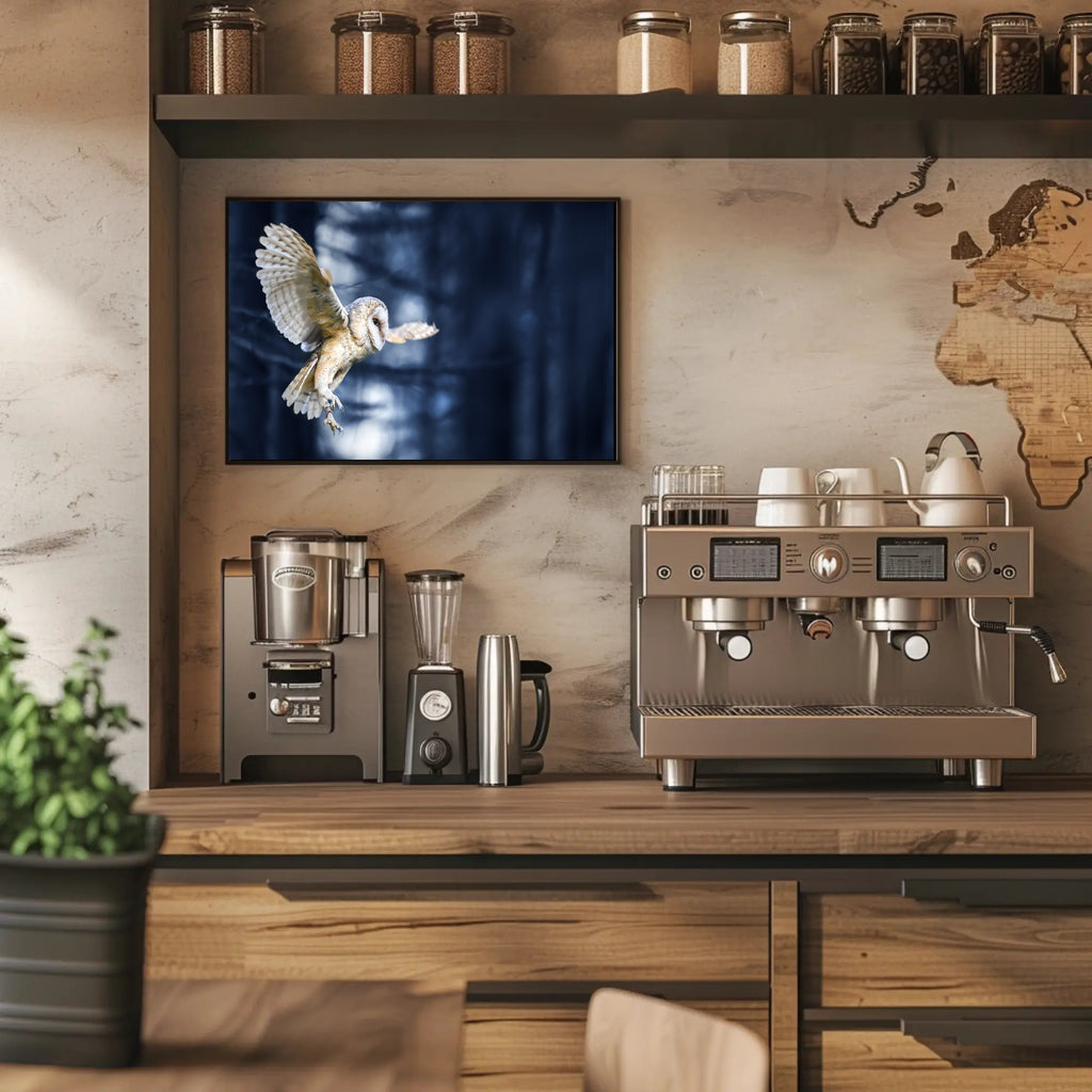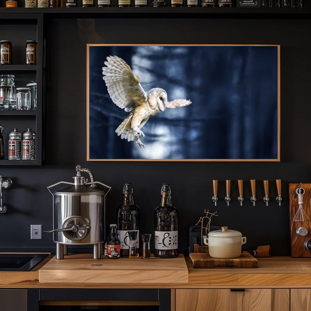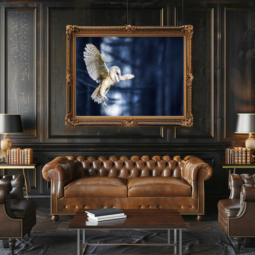 Majestic Barn Owl Flight in Nocturnal Forest captures a powerful moment of nature — a barn owl frozen mid-flight against a moody, deep-blue woodland backdrop. The high-contrast composition and soft bokeh of the nocturnal forest create a cinematic focal point that elevates any room with a sense of calm, mystery, and refined wildlife beauty.