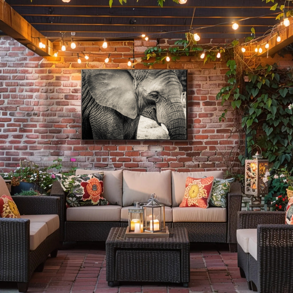 - Detailed wildlife photography: A dramatic close-up that showcases the elephant's skin, ear textures, and gentle eye—perfect for animal lovers and fans of wildlife poster art.