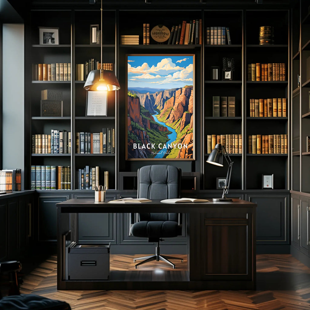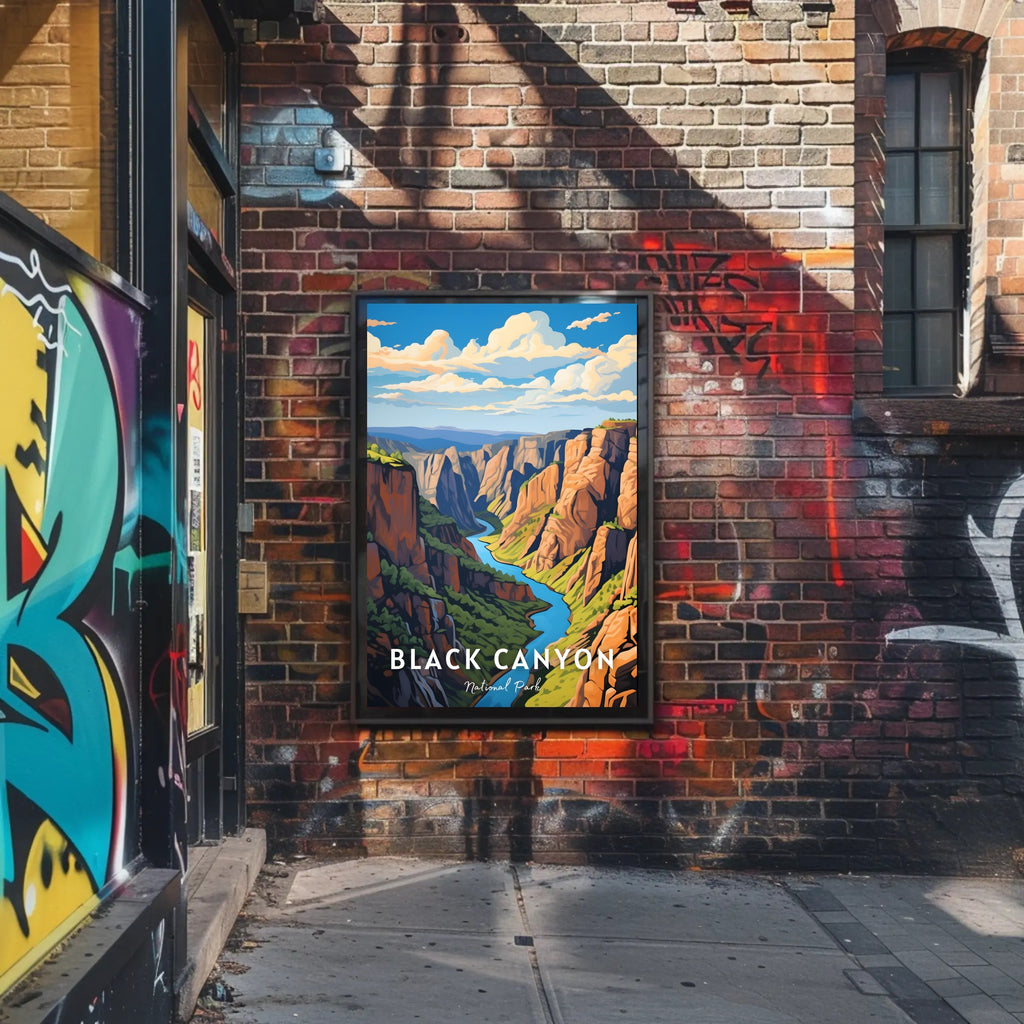 Elevate your space with this stunning depiction of Black Canyon, where vibrant colors and dramatic landscapes converge to create a majestic national park scene. This poster highlights the grandeur of steep, rugged cliffs with a winding river coursing through the valley, and an expansive sky filled with expressive clouds. The art style masterfully blends realism with bold, vivid colors, capturing a sense of awe and adventure. Perfect for nature enthusiasts or anyone needing a touch of inspiration, this piece celebrates the natural beauty and adventurous spirit of outdoor exploration. Bring the splendor of Black Canyon into your home or office space.