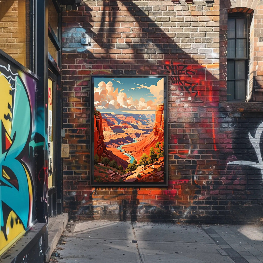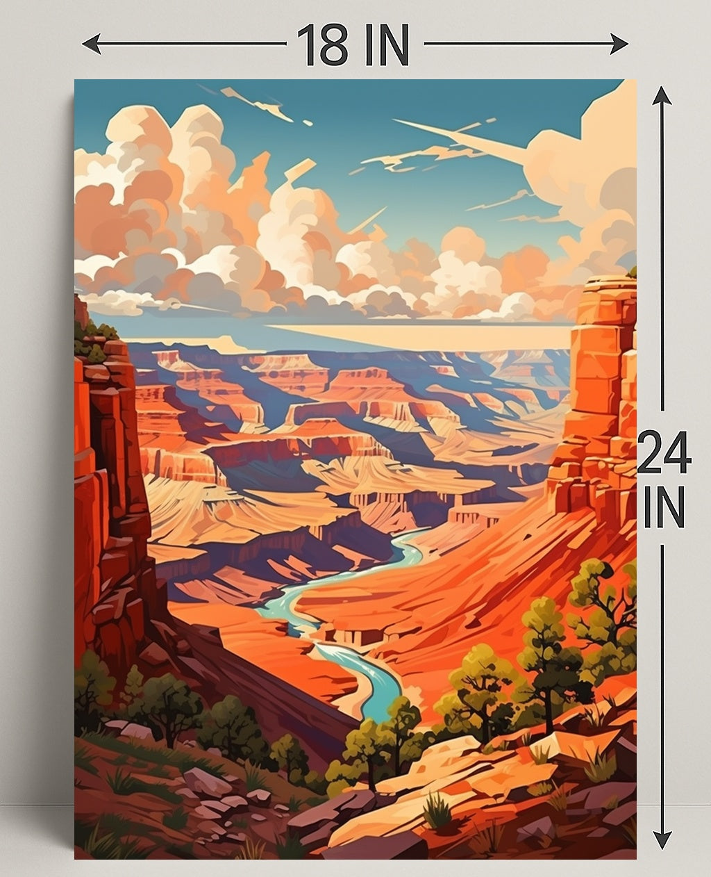 Bring the grandeur of the desert home. The Majestic Canyon Vista Poster from PosterGoat captures a sweeping canyon vista rendered in bold, scenic color — dramatic red rock cliffs, a winding turquoise river, layered plateaus and billowing clouds create a timeless travel-inspired focal point for any room.