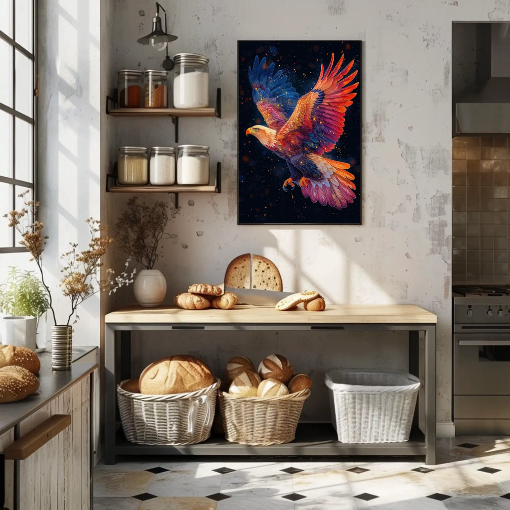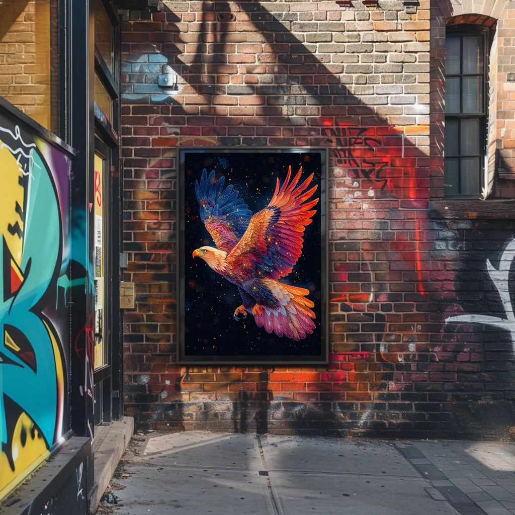 Experience the awe-inspiring beauty of a majestic eagle in flight, rendered in vibrant shades of blue, orange, purple, and red. The eagle's detailed feathers are adorned with star-like speckles, creating a sense of cosmic movement and energy. Set against a deep, dark blue background with glowing orbs, this fantastical design evokes a mystical and ethereal quality.