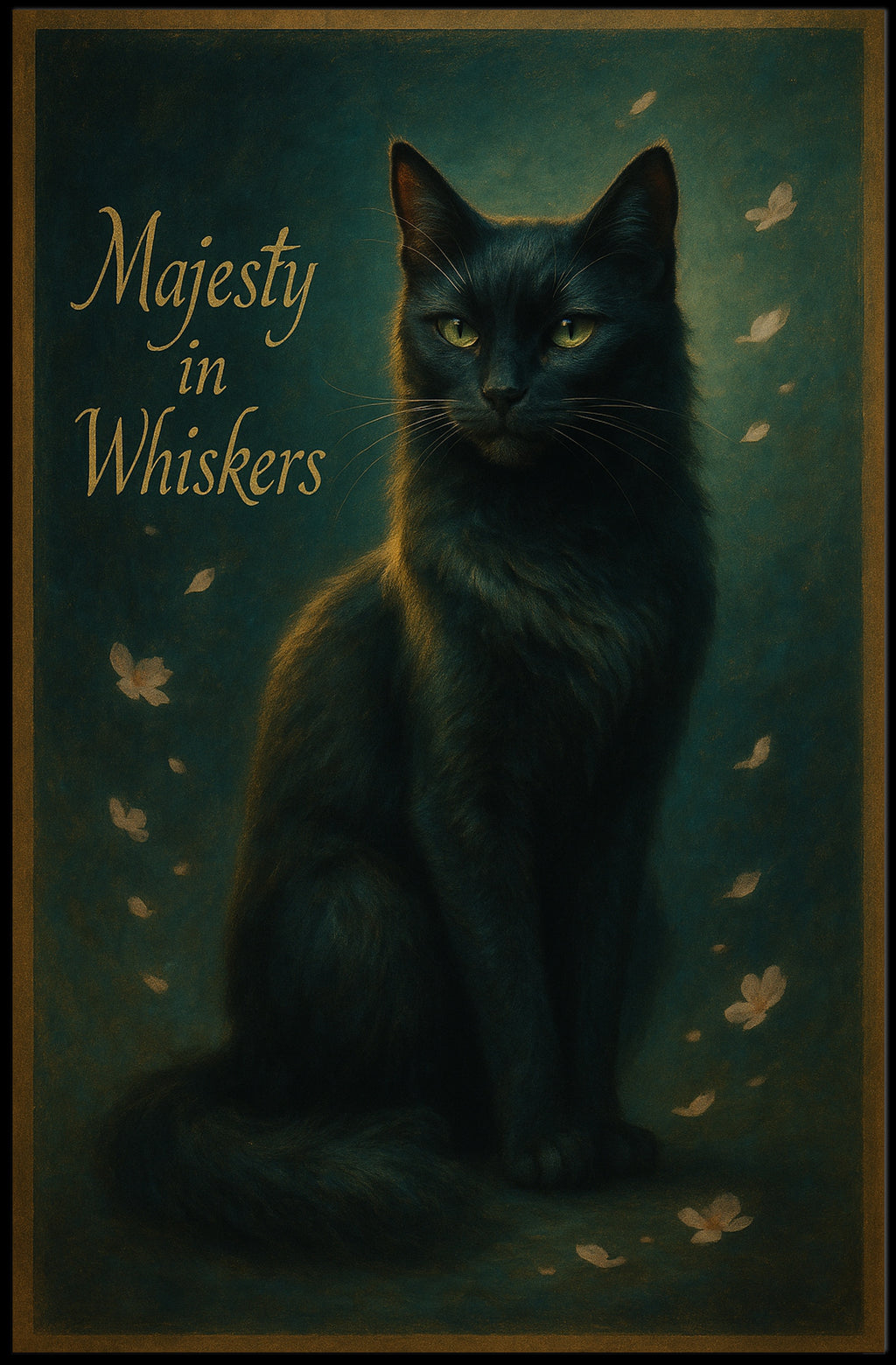 Majestic Dark-Furred Cat Animal Poster — a photorealistic, vintage-style masterpiece from PosterGoat that brings quiet elegance and mystical charm to any room. This striking artwork features a regal dark-furred cat, rendered with painterly detail and rim lighting that highlights plush fur and expressive, almond-shaped eyes. Delicate floating petals drift through a deep, moody backdrop, creating a serene, enchanting scene that complements minimalist and artful interiors.