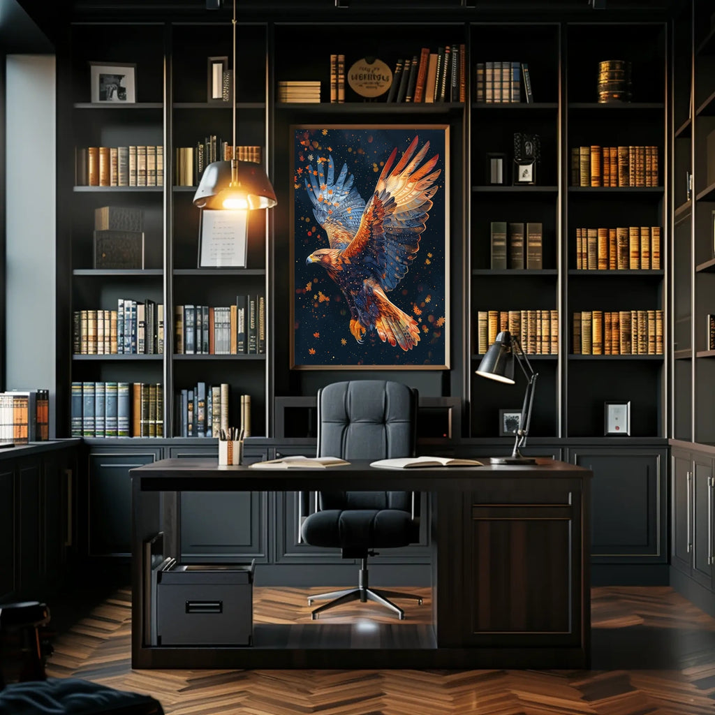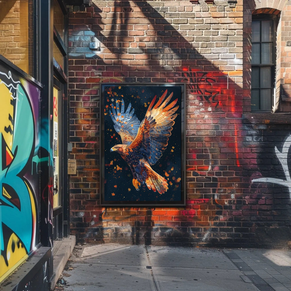 Experience the awe-inspiring beauty of nature with this captivating poster, showcasing a dynamic illustration of an eagle soaring through a dark, starry sky. The eagle's vibrant feathers, painted in fiery blues, oranges, and reds, create a stunning contrast against the celestial backdrop. Accompanied by scattered autumn leaves, the design exudes movement and vitality. This modern and fantastical artwork captures the essence of freedom and power, making it a perfect addition to any space celebrating wildlife, strength, or the enchanting colors of the autumn season. Ideal for nature lovers and art enthusiasts alike.