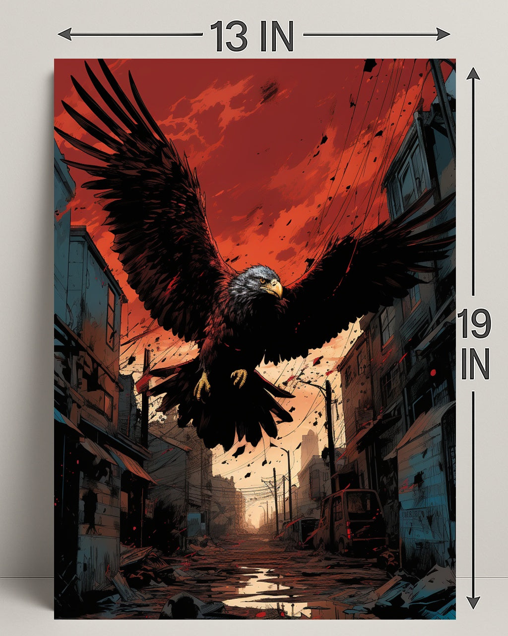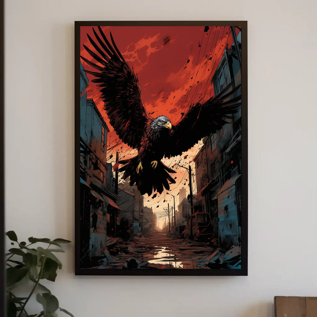 Capture a striking fusion of nature and urban grit with the Majestic Eagle In Urban Ruins Poster from PosterGoat. This dramatic wall art places a powerful eagle with outstretched wings against a blood-red sky, soaring above a desolate city street strewn with debris and reflective puddles — a bold statement piece for any home or office.