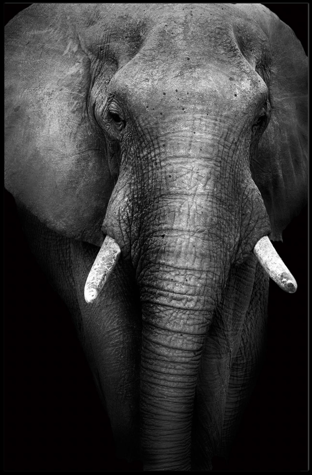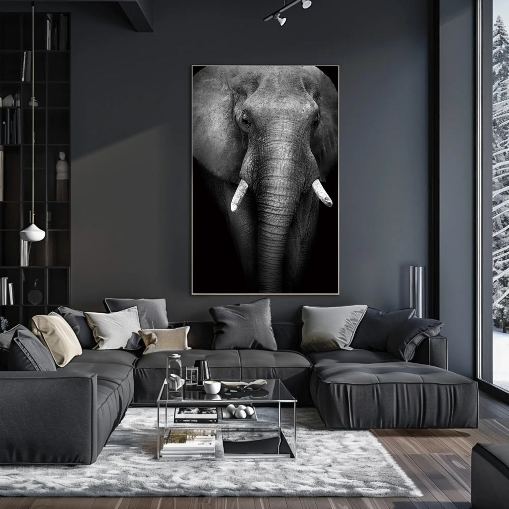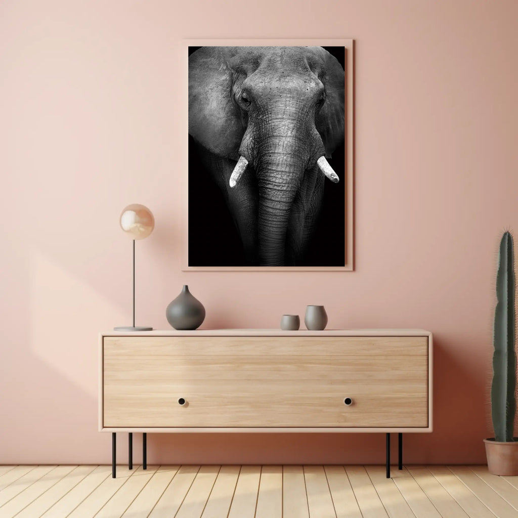 This stunning black-and-white poster captures the majestic essence of an elephant through an impeccable close-up that focuses on its face and tusks. The photorealistic style intensifies the beauty of the elephant's textured skin and prominent tusks, bringing an awe-inspiring and timeless quality to any space. The high-contrast design highlights the intricate details of the elephant, evoking a profound sense of respect and admiration for this magnificent creature. Perfect for wildlife enthusiasts and art lovers, this poster adds a touch of sophistication and natural wonder to your decor.