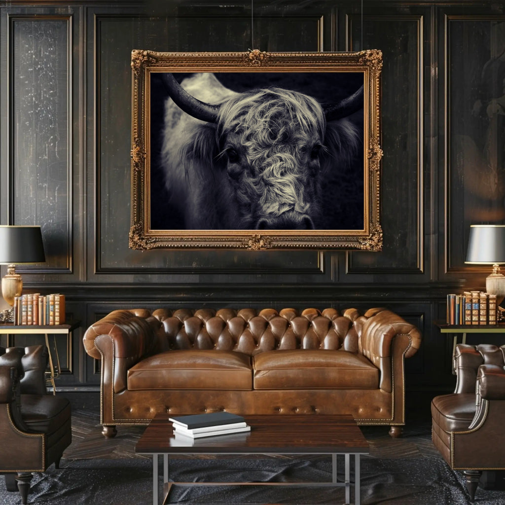 Grace your space with this striking portrait of a highland cow, capturing its distinctive long horns and iconic shaggy coat. This animal poster exudes an aura of rustic majesty, often associated with the enchanting and untamed landscapes of Scotland. It makes for a perfect addition to your decor, bringing a touch of wild elegance and natural beauty to any living area. Whether you're an animal enthusiast or looking to infuse a bit of countryside charm into your surroundings, this highland cow poster will captivate attention and inspire admiration.