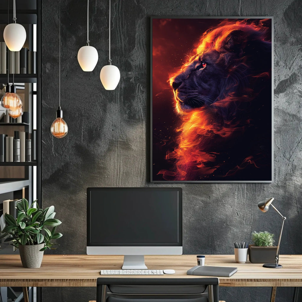 Discover the captivating allure of this lion poster, where the majestic creature's head is vividly portrayed against a deep, dark backdrop. This artwork symbolizes strength and majesty, with the lion's mane depicted in fiery, flowing colors that mimic the intensity of flames. The photorealistic style merges with surreal artistry, creating a dynamic and ethereal visual experience. The dramatic use of light and color enhances the fierce and intense mood, making it a perfect piece for those who appreciate themes of power, courage, and leadership. Ideal for adding a bold statement to any space.