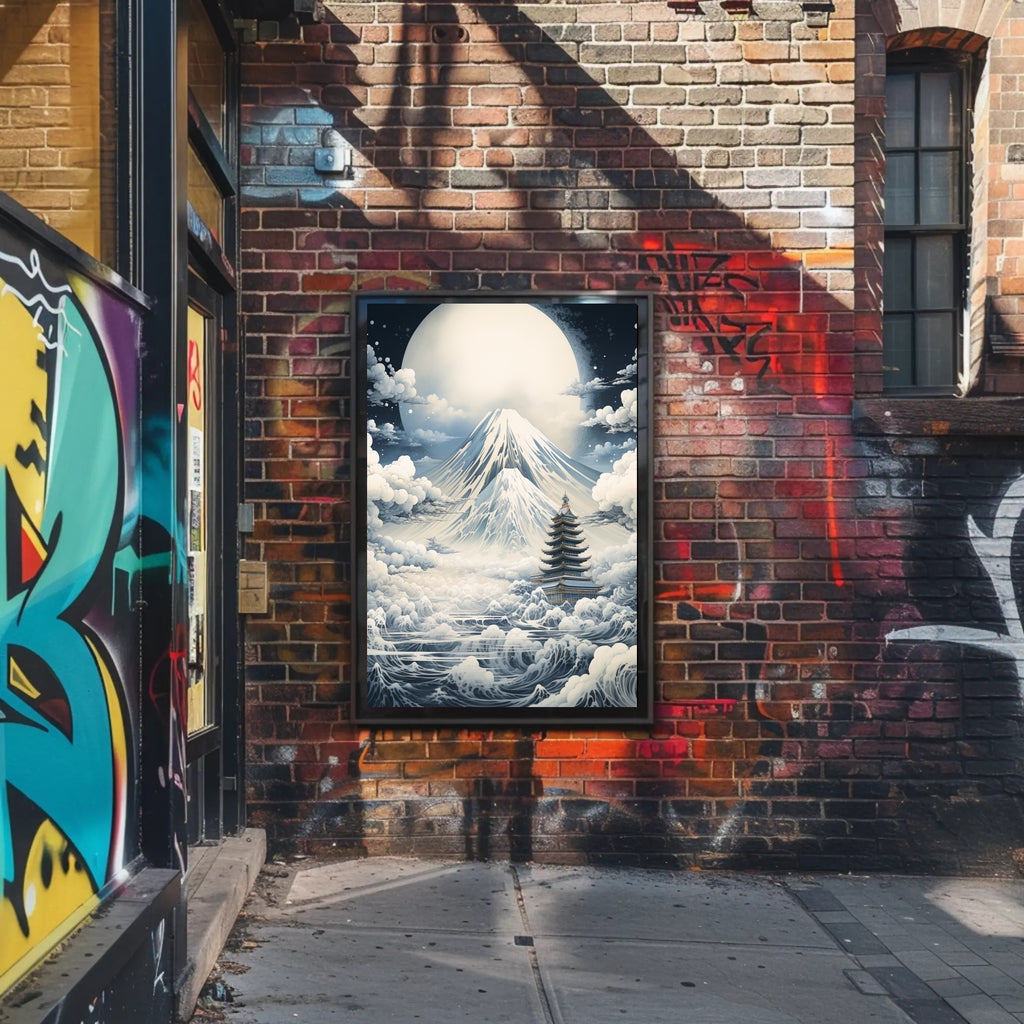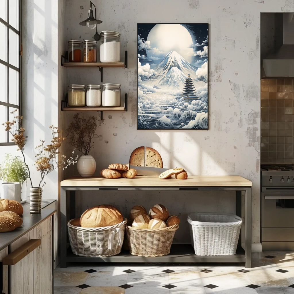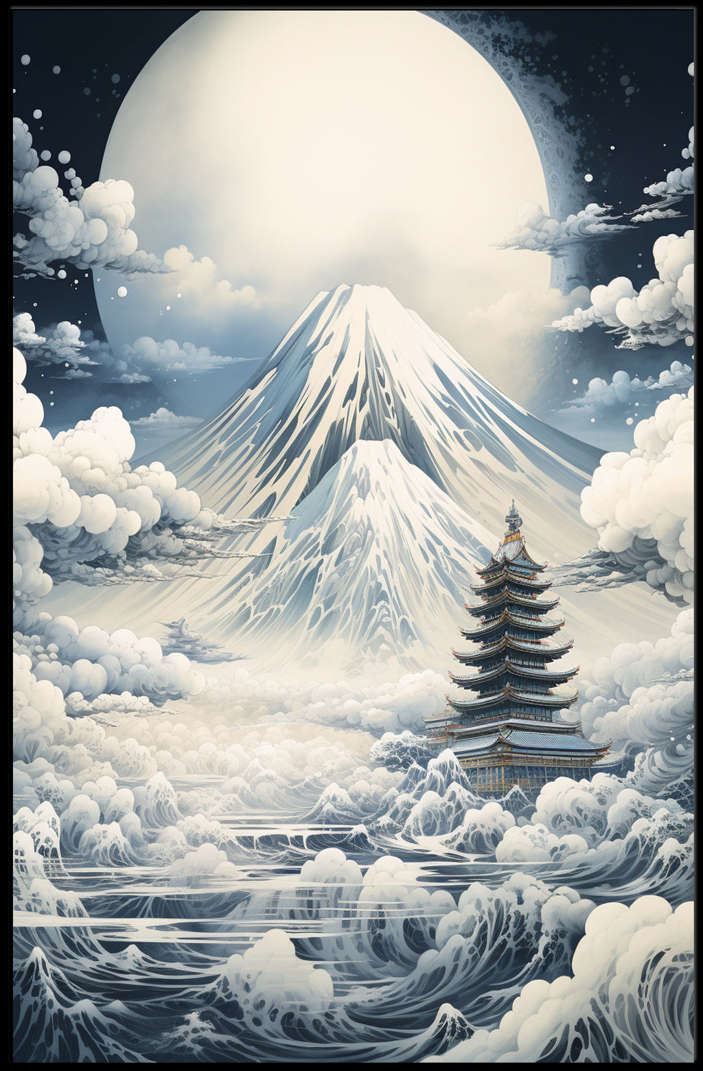Rendered in a cool blue-and-gray palette, the composition pairs dramatic waves, drifting clouds, and a tiered pagoda against a towering, snow-capped Fuji and oversized moon. The result is a tranquil, almost otherworldly atmosphere that complements Mid-Century Modern and minimalist interiors while acting as a focal point in living rooms, bedrooms, and offices.