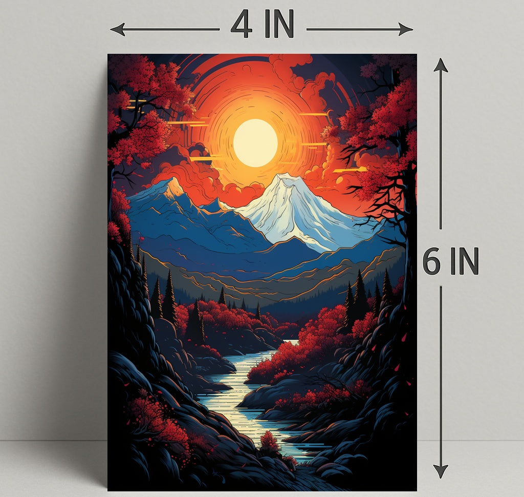 Bring the wild beauty of sunset mountains into your home with the Majestic Mountain Sunset Poster from PosterGoat. This striking poster blends bold pop-art lines and rich, cinematic color—an oversized golden sun, a snow-capped peak, glowing red foliage and a reflective river that draws the eye deep into the scene.
