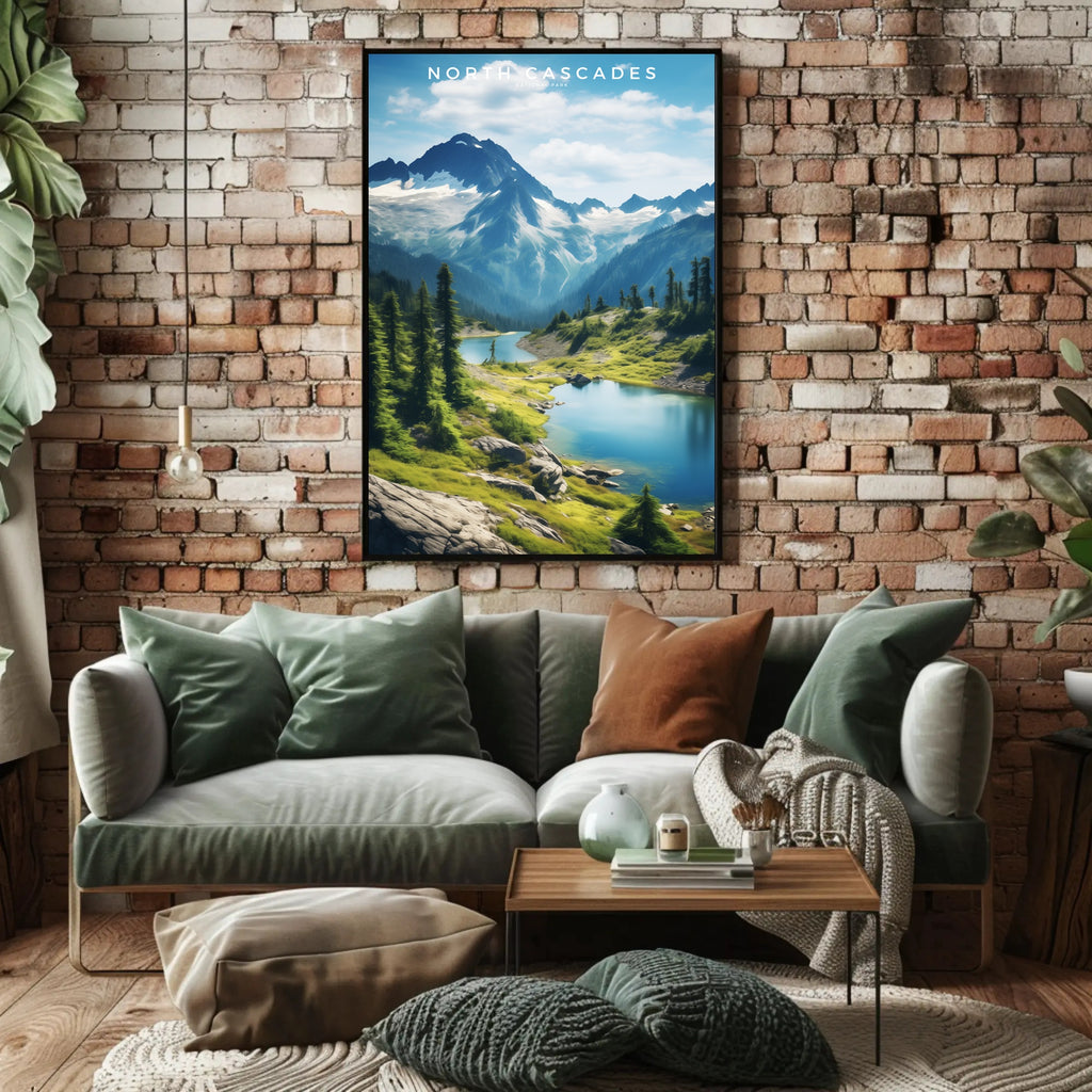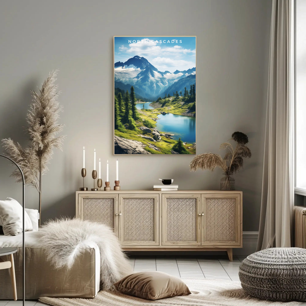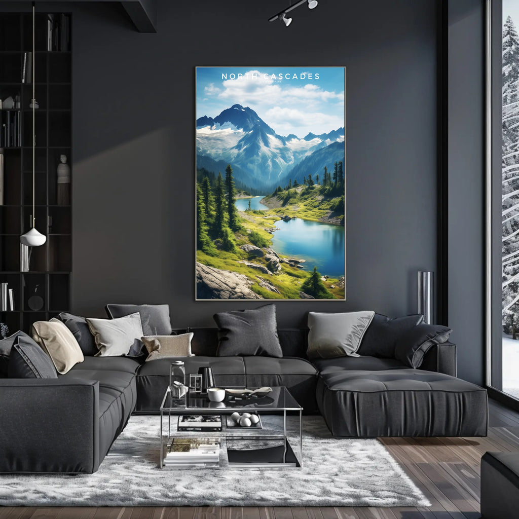 - Minimalist travel aesthetic: Clean typography at the top reads “NORTH CASCADES,” giving the poster a vintage travel-poster feel while staying modern and minimal.