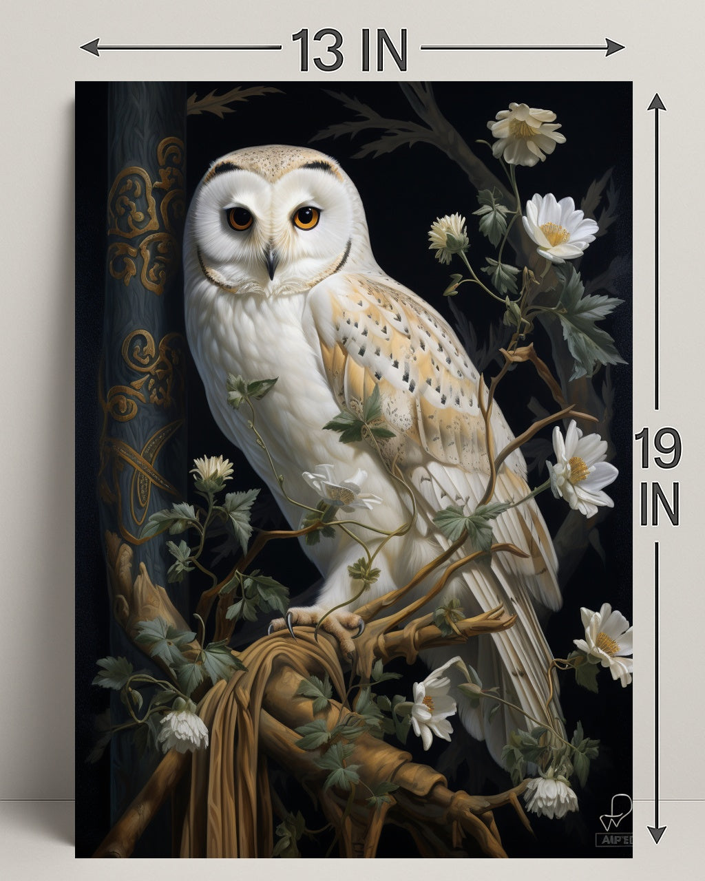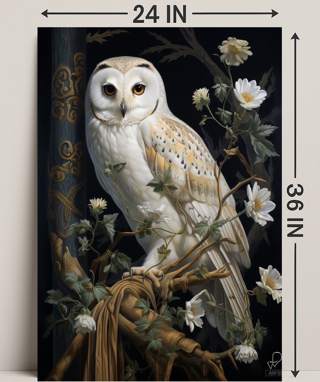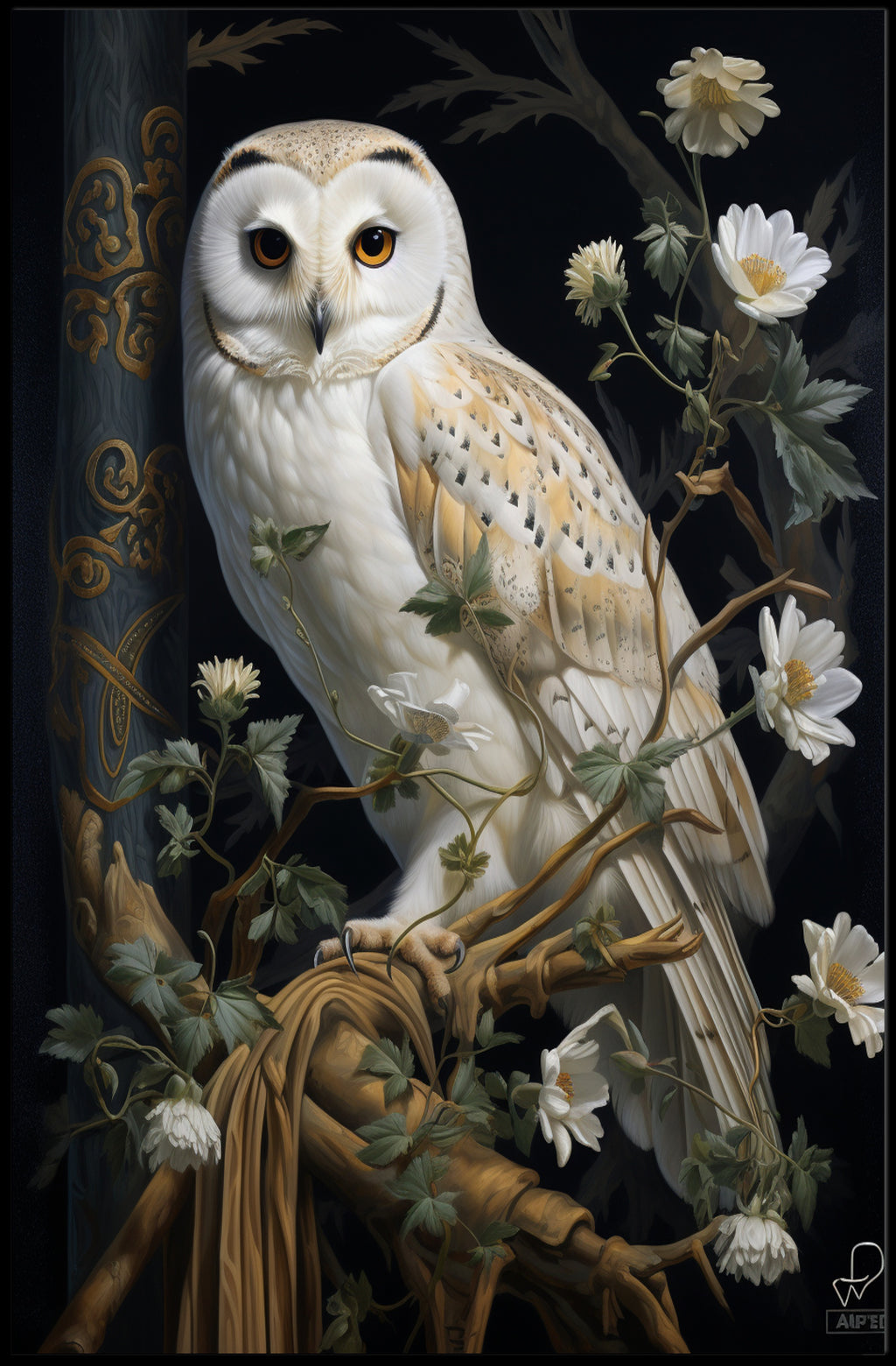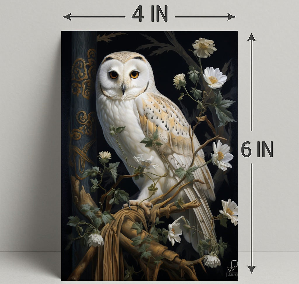 Majestic Owl In Bloom Poster — an artful centerpiece from PosterGoat that brings nature’s elegance and timeless charm to your walls. This high-impact poster features a finely detailed barn-owl poised among delicate white blooms and winding vines against a dramatic dark backdrop, creating a striking focal point for any room.