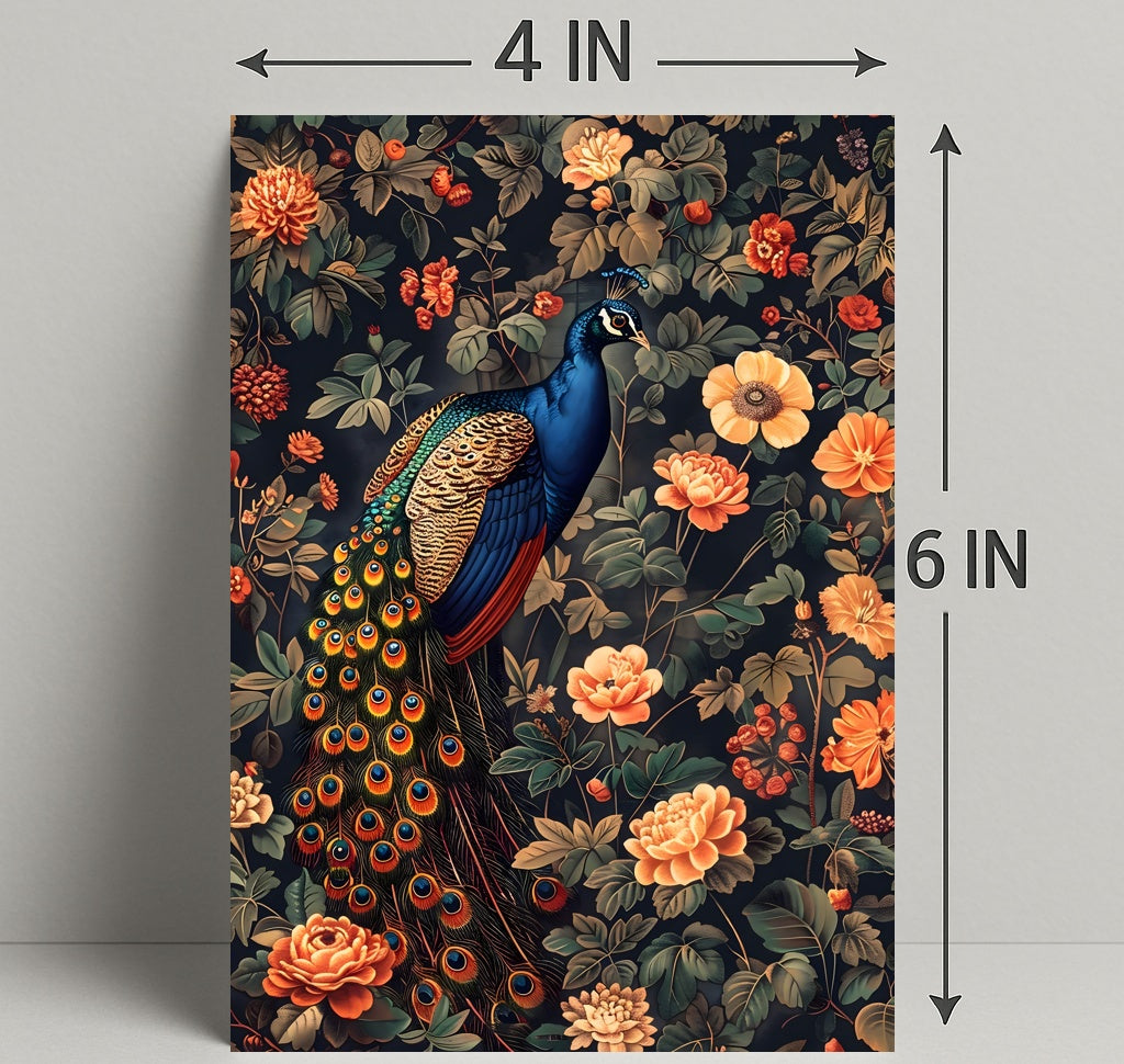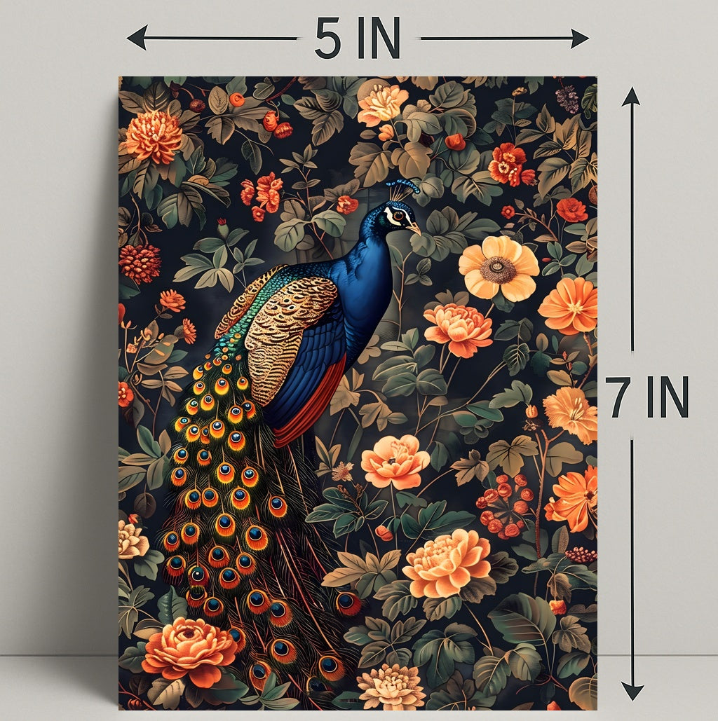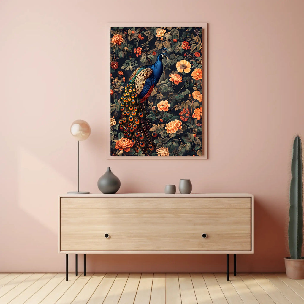 Why you’ll love it: The dramatic contrast between the dark background and the warm floral palette draws the eye while the elegant peacock motif adds character and sophistication. Whether used as a single statement piece or layered with complementary prints, this poster transforms ordinary walls into curated art displays.