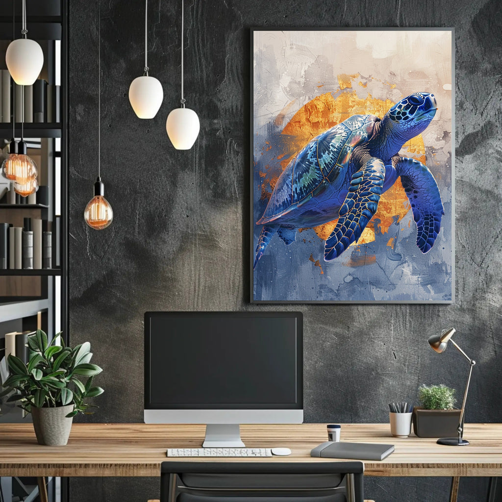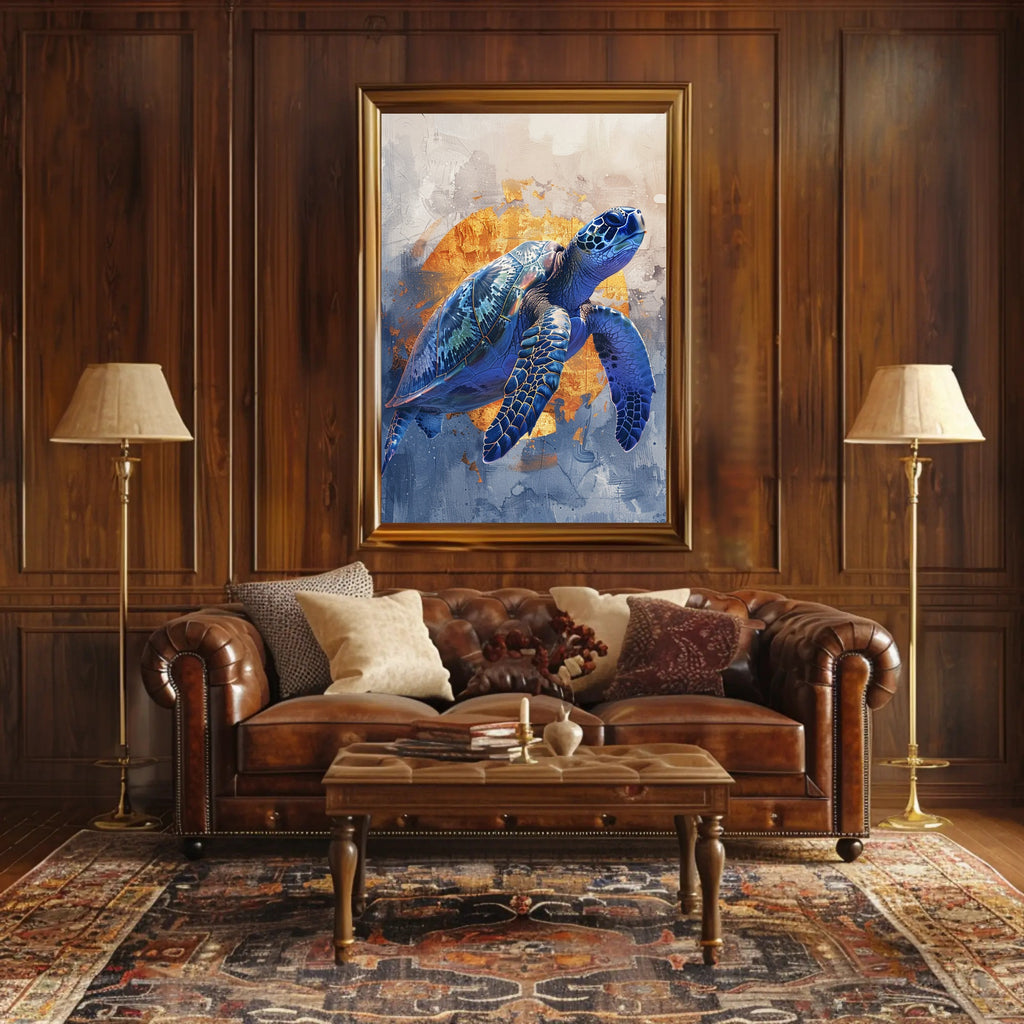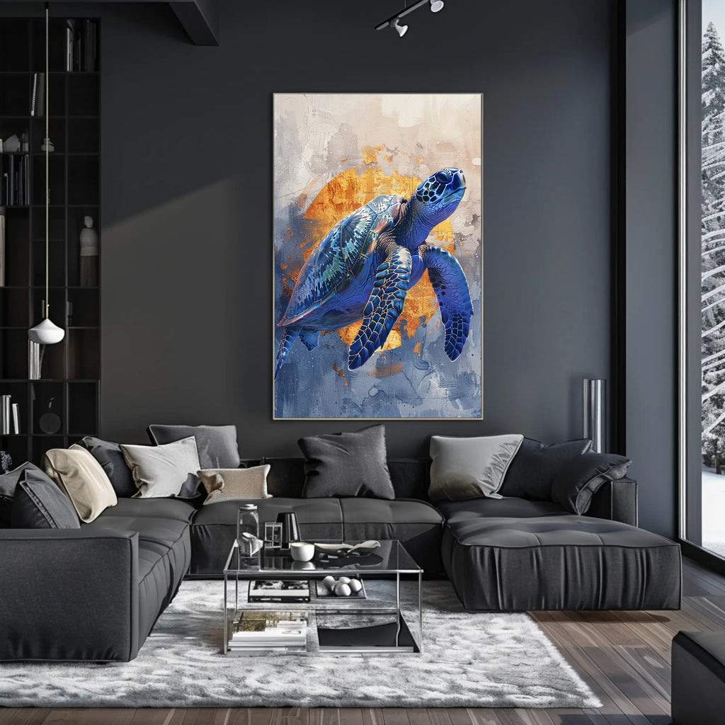 - Eye-catching design: Rich cobalt and indigo tones on the turtle’s shell and flippers contrast with a textured gray canvas and radiant gold circle, creating depth and movement that draw the eye.