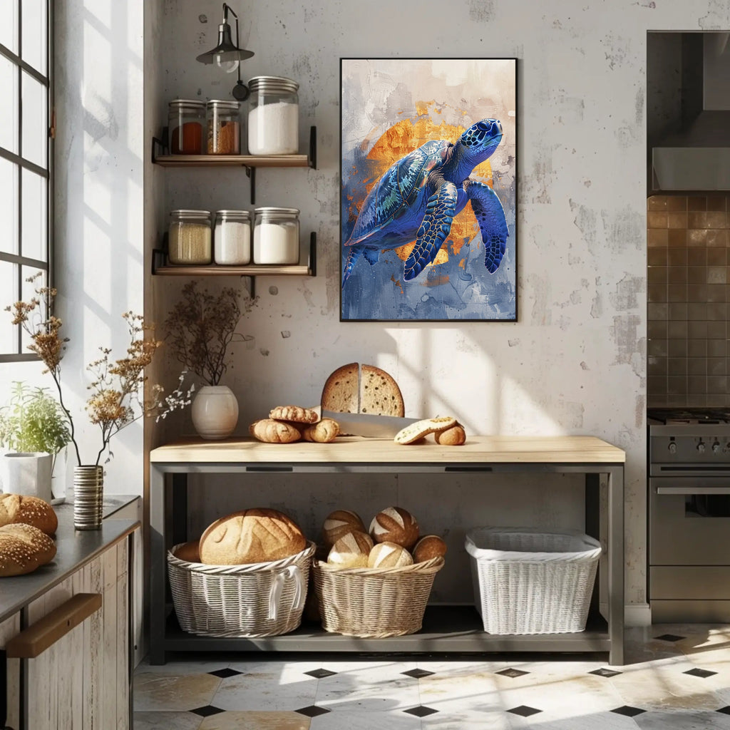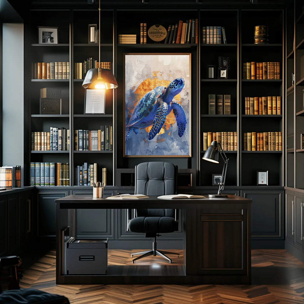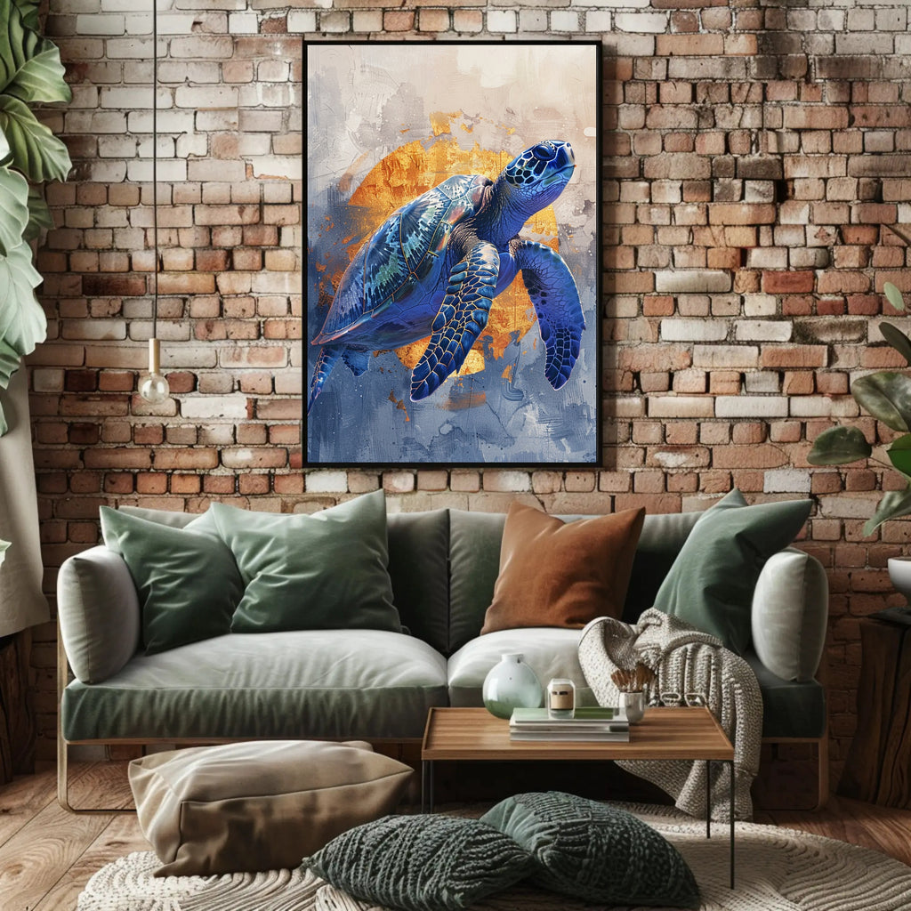 - Eye-catching design: Rich cobalt and indigo tones on the turtle’s shell and flippers contrast with a textured gray canvas and radiant gold circle, creating depth and movement that draw the eye.